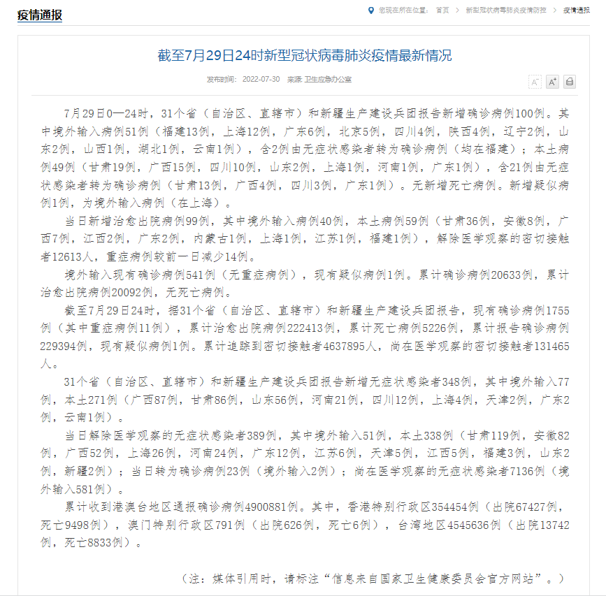 7月29日0—24时,31个省(自治区、直辖市)和新疆生产建设兵团报告新增确诊病例100例。其中境外输入病例51例(福建13例,上海12例,广东6例,北京5例,四川4例,陕西4例,辽宁2例,山东2例,山西1例,湖北1例,云南1例),含2例由无症状感染者转为确诊病例(均在福建);本土病例49例(甘肃19例,广西15例,四川10例,山东2例,上海1例,河南1例,广东1例),含21例由无症状感染者转为确诊病例(甘肃13例,广西4例,四川3例,广东1例)。无新增死亡病例。新增疑似病例1例,为境外输入病例(在上海)。