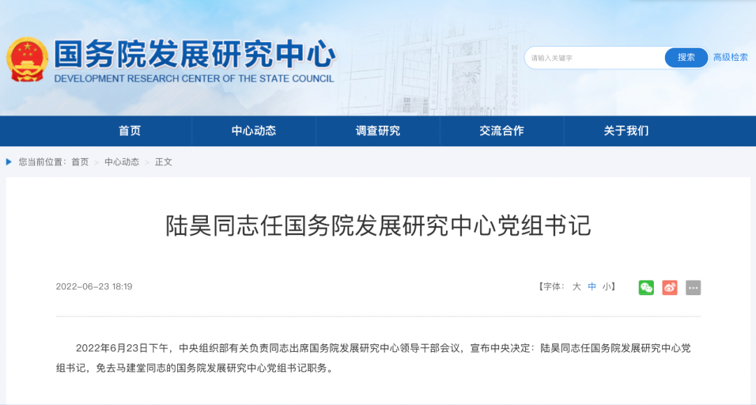 据国务院发展研究中心官网消息,6月23日下午,中央组织部有关负责同志出席国务院发展研究中心领导干部会议,宣布中央决定:陆昊同志任国务院发展研究中心党组书记,免去马建堂同志的国务院发展研究中心党组书记职务。