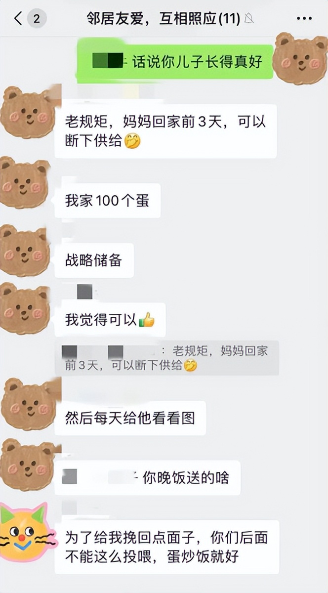 在“邻居友爱,互相照应”微信群里,热心的阿姨们和佑佑家随时沟通联络——要做核酸了,提醒佑佑走绿色通道;分发物资了,也通知佑佑妈一声;孩子头发长了,她们找了位邻居帮忙理发……为此,佑佑妈不禁感慨:“儿子被邻居们照顾很好。陌生人都能正能量,更何况是我们呢?坚持,最后的胜利肯定属于我们。”
