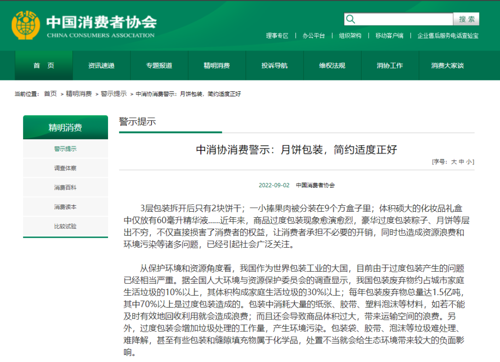 同时,中消协倡导广大消费者在节日选择月饼时,践行绿色低碳的生活方式,追求文明、健康的生活理念,主动选择包装简约适度的产品,抵制奢华浪费的包装产品,摒弃华而不实的“面子工程”,在欢度传统佳节、品尝传统美食、共享阖家团圆传统文化的同时,继承弘扬中华民族勤俭节约的传统美德,共同营造绿色、环保、节约资源的可持续消费环境。