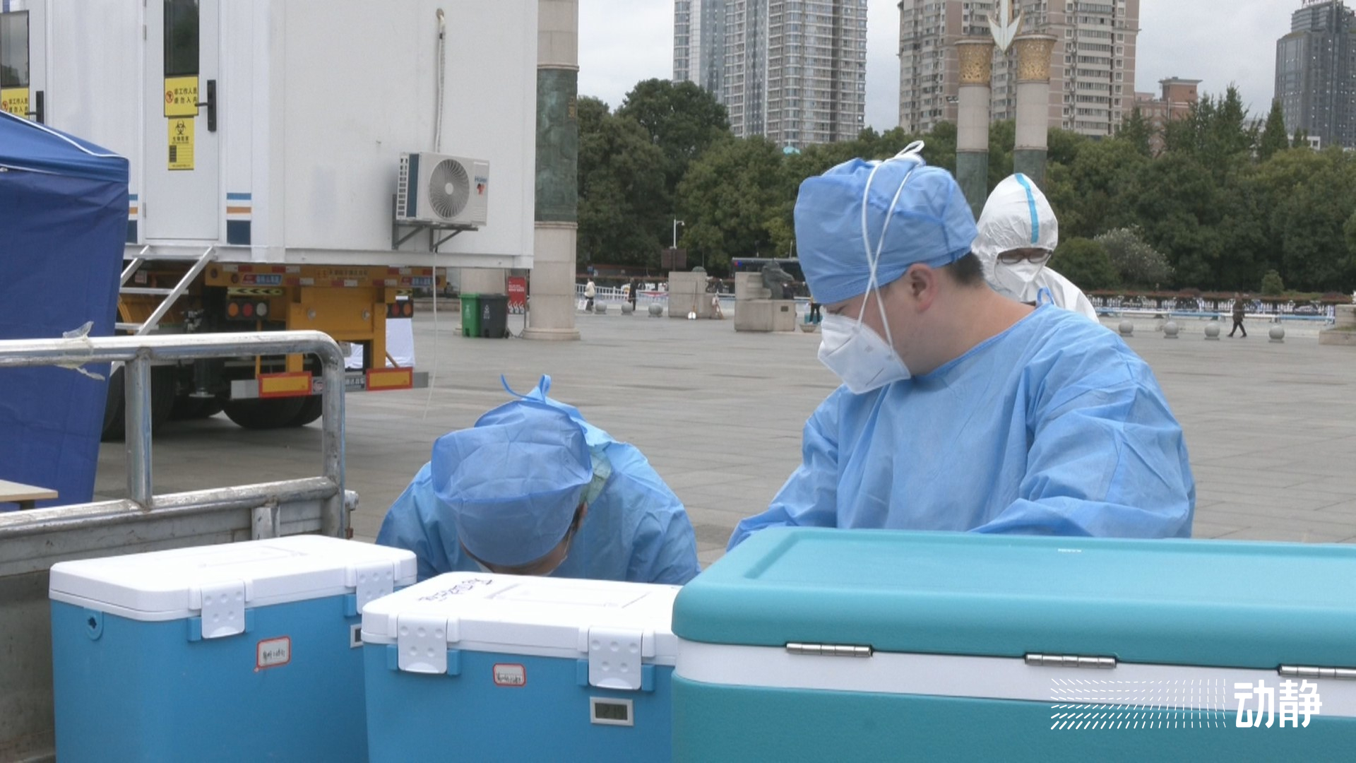 在贵阳市南明区筑城广场,周边各个街道收集的核酸检测样本陆续送到这里的12台移动核酸检测实验室。工作人员告诉记者,从昨晚11点开始到今天中午12点,他们已经将7800多管,共计62000多人的核酸样本在这里进行了检测。