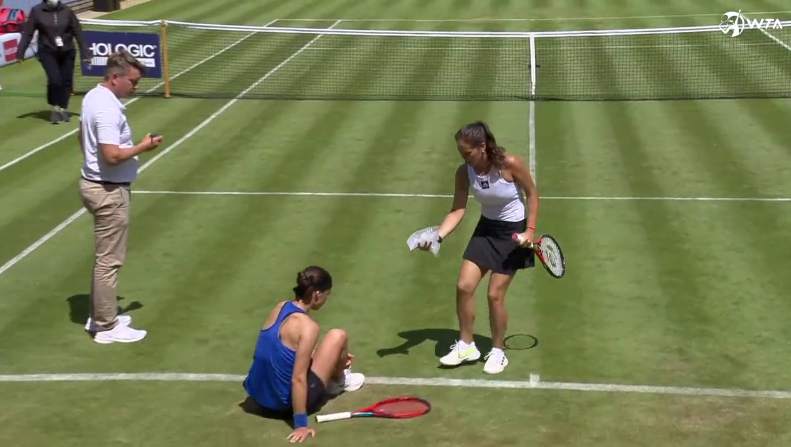 报道称,乌克兰选手卡利尼娜在当天比赛第二盘开始后摔倒,似乎扭伤了脚踝。俄罗斯选手卡萨金娜没有利用这段时间休整,而是跑过去帮忙送上冰袋,卡利尼娜也接过冰袋敷在脚踝处。“卡萨金娜是本次巡回赛中最受欢迎的球员之一,看到她这样做真的很高兴,”一名解说员说道。现场画面显示,在卡萨金娜递出冰袋后,现场响起掌声。