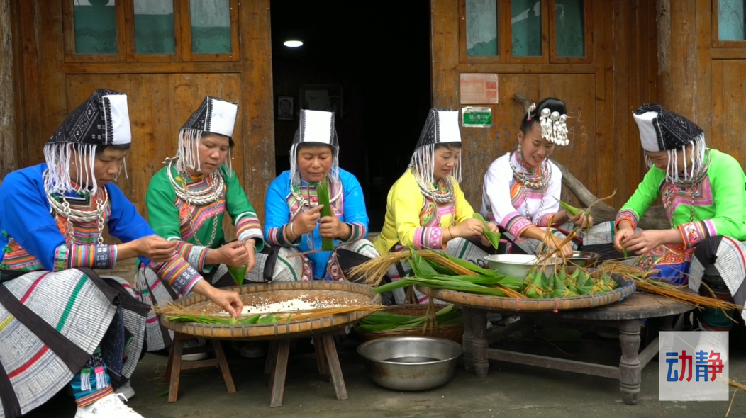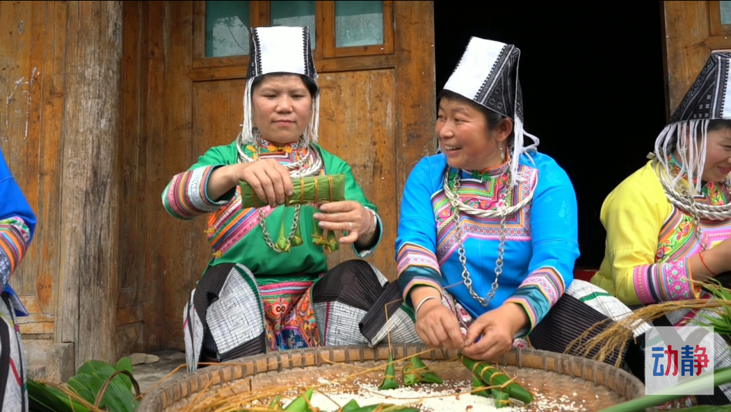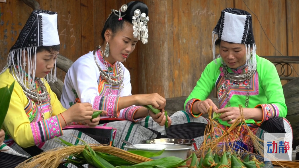 把家里的糯米清洗干净,放盆里,开始加上一些刚刚过滤出来的水,量要把控好适量即可,过多导致颜色更加深黑,味道过于咸,最后再加上一些喜欢的食材,把它们融合在一起,就可以包了,一家人就坐在一起,一边拉起家常一边包粽子,有的放米、有的捆绑,分工明确,速度也很快,不一会就包完了,她们包的形状,有的还独具特色,有一个长长方方的粽子,下面在挂上一些小小的粽子,像她们自己带的银饰一样,名字叫“母子粽”,包好以后,给小孩子带在身上,祈求健康平安。全部包好后,放入锅中掺上刚刚过滤出来的黑水和一些清水混合,煮2到3个小时这道天然食材、色泽淡黑的“草灰粽”就制作完成了。