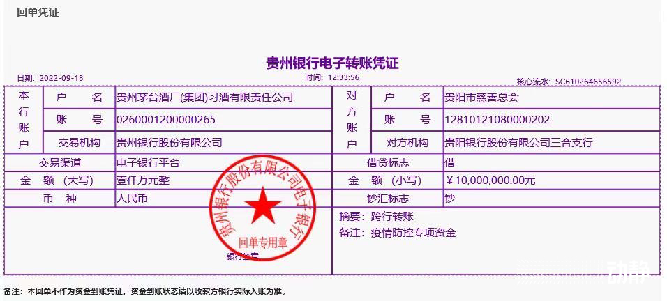 9月13日,贵州茅台酒厂(集团)习酒有限责任公司向贵阳市慈善总会捐赠1000万元。