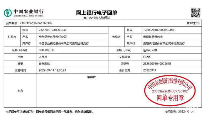 9月14日,华创证券有限责任公司累计向贵州省慈善总会捐赠500万元资金及50万元抗疫物资。