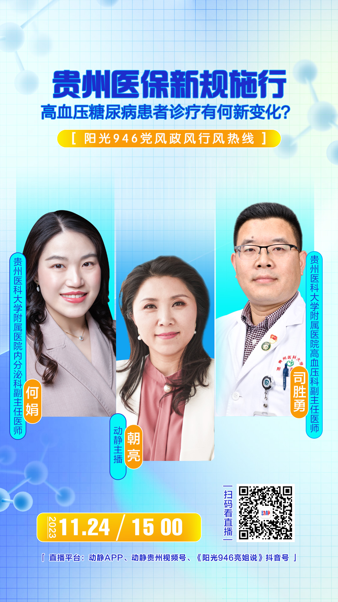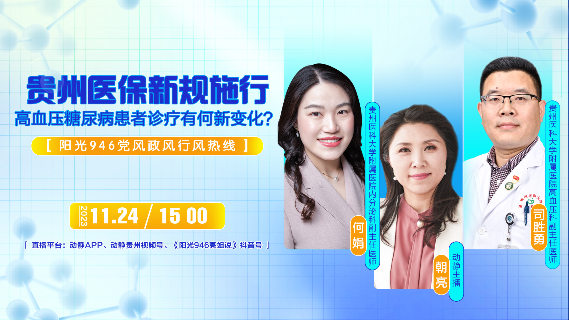今天(11月24日)15:00,动静邀请贵州医科大学附属医院高血压科副主任医师司胜勇、贵州医科大学附属医院内分泌科副主任医师、博士何娟共同做客《阳光946》直播间,与主持人朝亮一起从看病、到治疗、再到报销,手把手教你理清高血压糖尿病门诊看病如何省钱,如何有效用药。