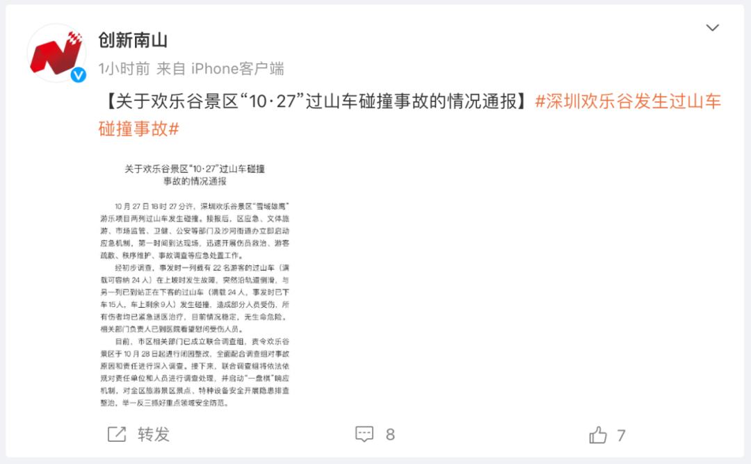 10月27日,深圳欢乐谷发生过山车碰撞事故,引起社会广泛关注。29日,深圳市南山区安全管理委员会办公室发布情况通报。