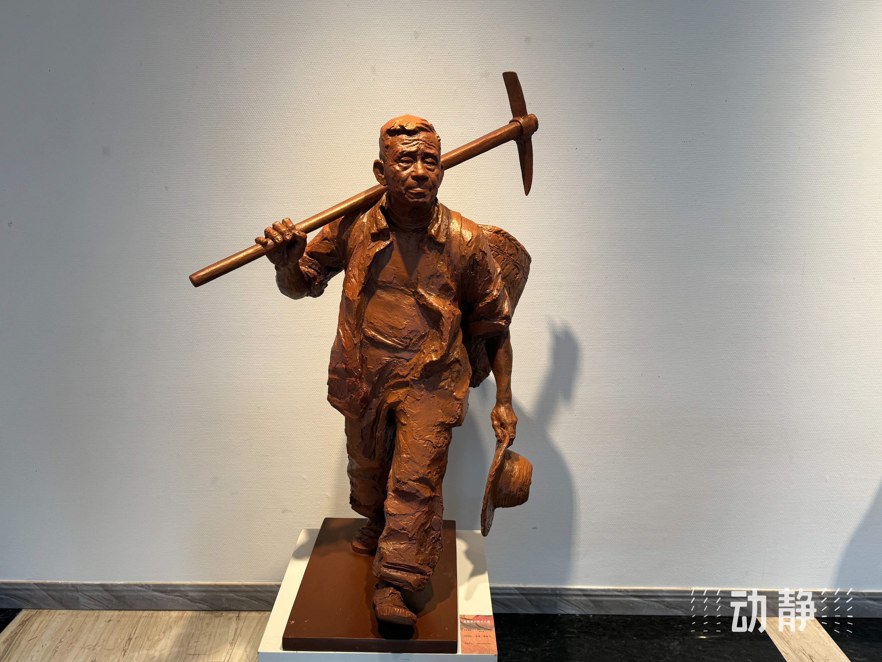 在王阳明雕塑的旁边,是雕塑作品《脊梁——时代楷模黄大发》。整个雕塑以泥土色为主基调。黄大发一手拿锄,一手拿帽,似乎正带领村民走在“开天渠”的道路上。