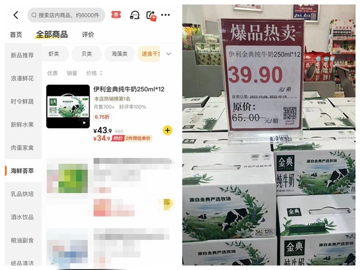 同一商超同一时间同款牛奶在线上和线下价格不同,线下更便宜。图右为线下价格。