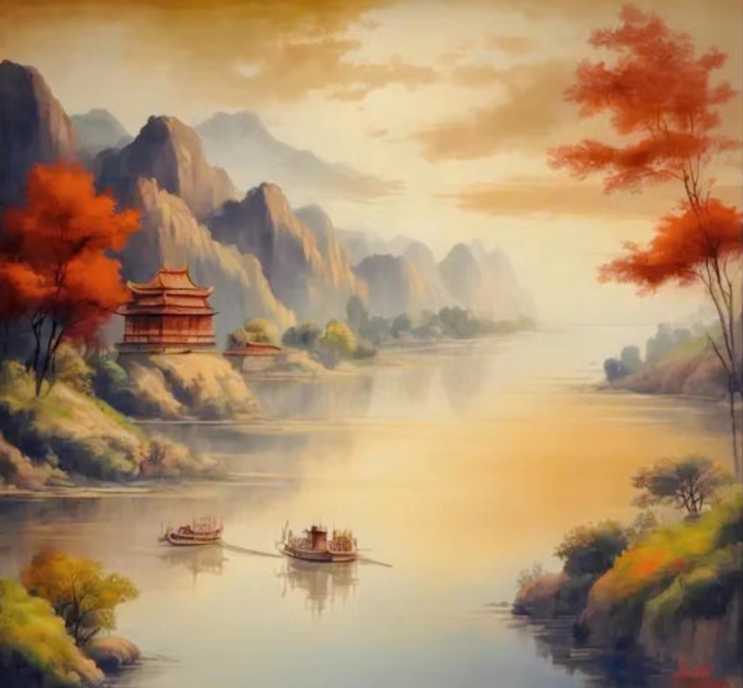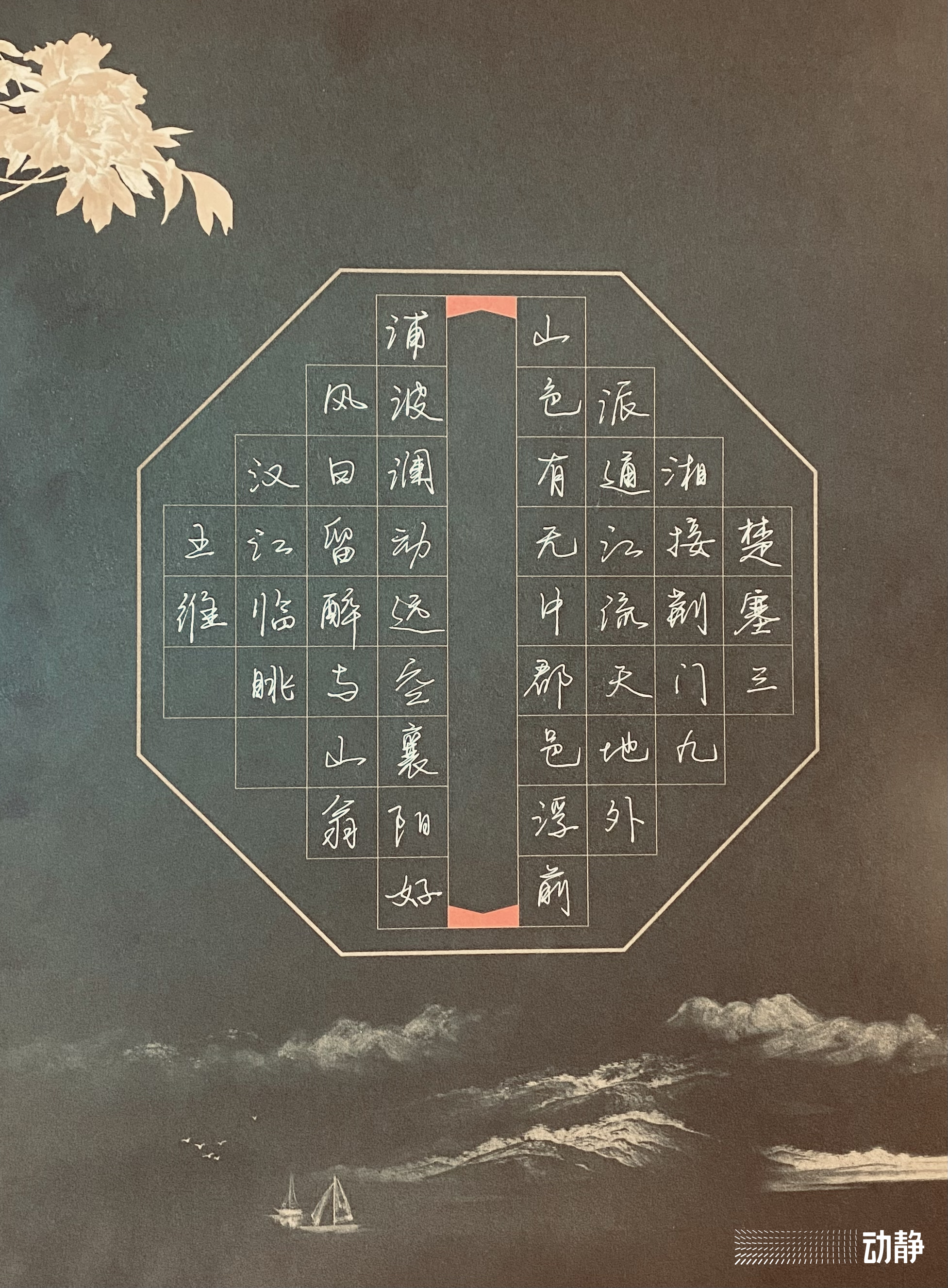 这是王维写汉江景色的名篇,大约作于玄宗朝开元末到襄阳主持"南选"之时。诗人在江中船上俯仰顾盼,看见江流浩渺、山原阔远的宏大景象,心胸为之开阔而豪迈。开始二句,"三湘""九派",给人以浩瀚雄阔的整体印象,真有尺幅千里之势。特别是"江流天地外,山色有无中"二句,前句极夸张之能事,极写江流的浩荡空阔;后句轻轻点染,写眺望山色似隐似现、若有若无,把那种在水光映照中变幻不定、朦胧迷离的感觉传神地写了出来。这两句诗传诵千古,后来欧阳修、苏轼都曾经引用过。而第三联中"浮"字、"动"字,写得极为生动精警,让人感到船在水中的波荡,一切景物都活动起来。从这些地方,表现出诗人高妙的艺术技巧。
