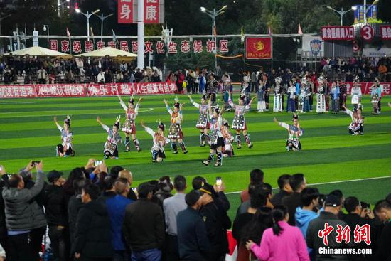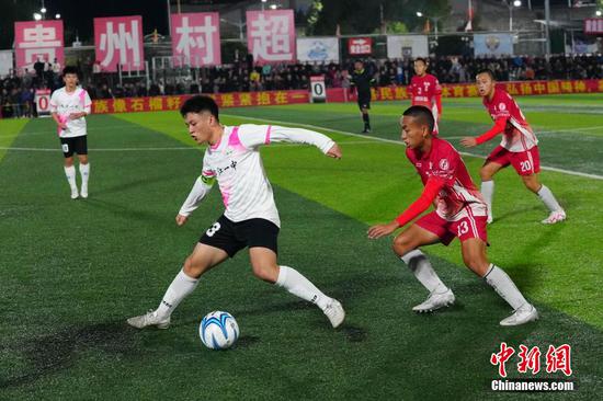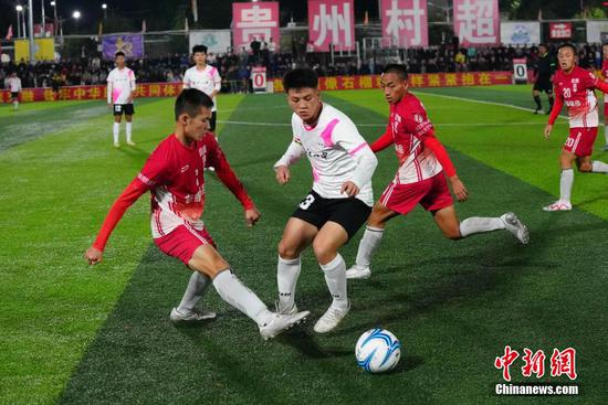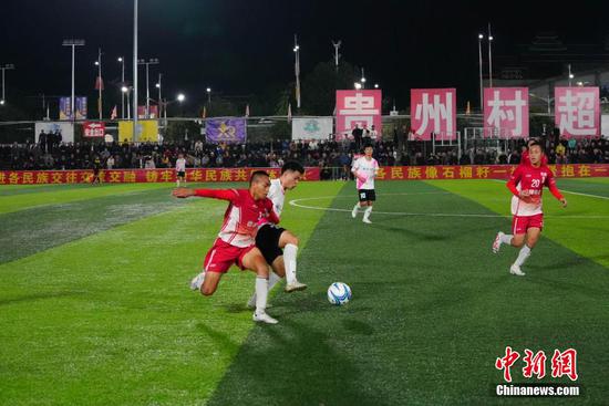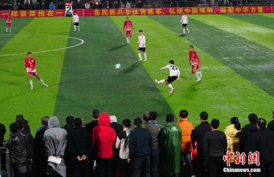 12月8日晚,贵州榕江一中与台湾宜兰高级中学足球友谊赛在贵州“村超”足球场进行。当晚,两校学生为当地民众带来了一场精彩的足球赛,当地侗族同胞在中场休息的时间表演了极具侗族风格特色的节目。图为贵州榕江一中足球队与台湾宜兰高级中学足球队(红色球衣)进行友谊赛现场。