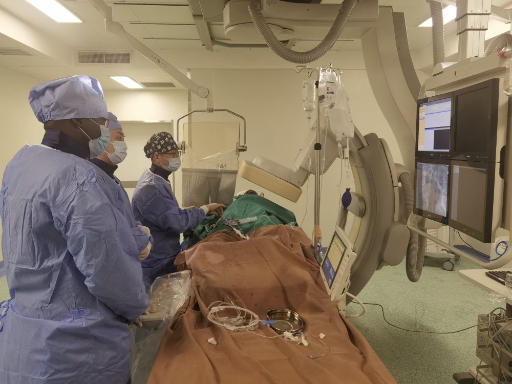 这是中几友好医院导管室建成后首台介入手术。王汝朋在麻醉科医生和手术室护士共同配合下,克服无备选耗材、导管路径头臂干严重迂曲等实际困难,通过造影结果明确患者为冠心病,为后续的治疗提供了依据。
