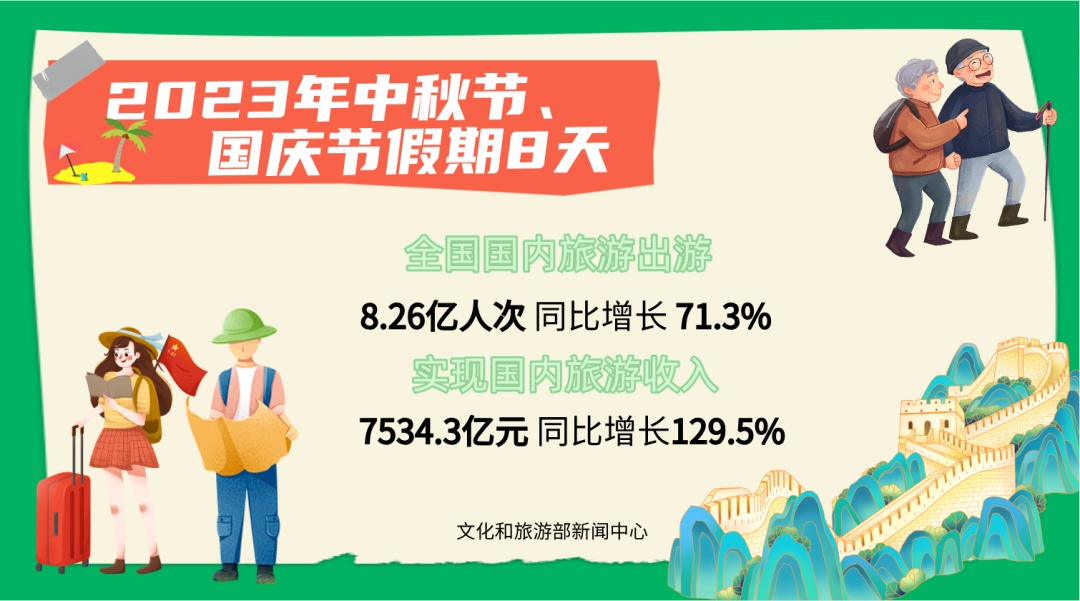 ▲经文化和旅游部数据中心测算,中秋节、国庆节假期8天,国内旅游出游人数8.26亿人次,按可比口径同比增长71.3%,按可比口径较2019年增长4.1%;实现国内旅游收入7534.3亿元,按可比口径同比增长129.5%,按可比口径较2019年增长1.5%。详情