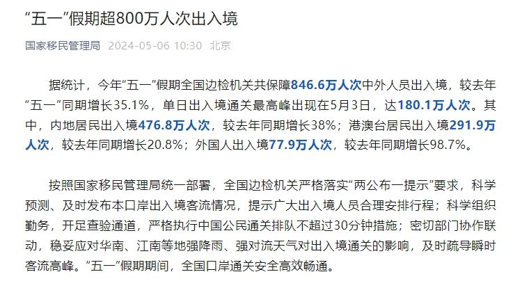 据统计,今年“五一”假期全国边检机关共保障846.6万人次中外人员出入境,较去年“五一”同期增长35.1%,单日出入境通关最高峰出现在5月3日,达180.1万人次。其中,内地居民出入境476.8万人次,较去年同期增长38%;港澳台居民出入境291.9万人次,较去年同期增长20.8%;外国人出入境77.9万人次,较去年同期增长98.7%。