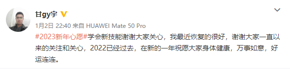 我最近恢复得很好,谢谢大家一直以来的关注和关心,2022已经过去,在新的一年祝愿大家身体健康,万事如意,好运连连。