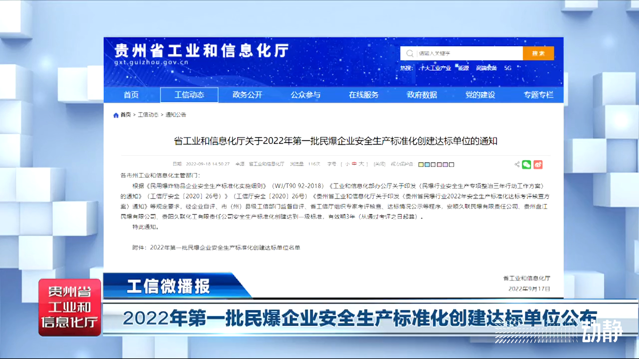近日,省工信厅公布2022年第一批民爆企业安全生产标准化创建达标单位,安顺久联民爆有限责任公司、贵州盘江民爆有限公司、贵阳久联化工有限责任公司安全生产标准化创建达到一级标准,有效期3年。