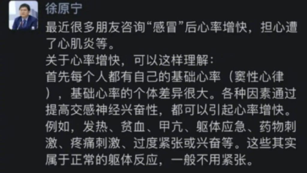 为了帮助大家答疑,12月17日,徐原宁医生在朋友圈发了一条长达1300+字的“心跳过快与心肌炎的说明”,引来上千的关注。