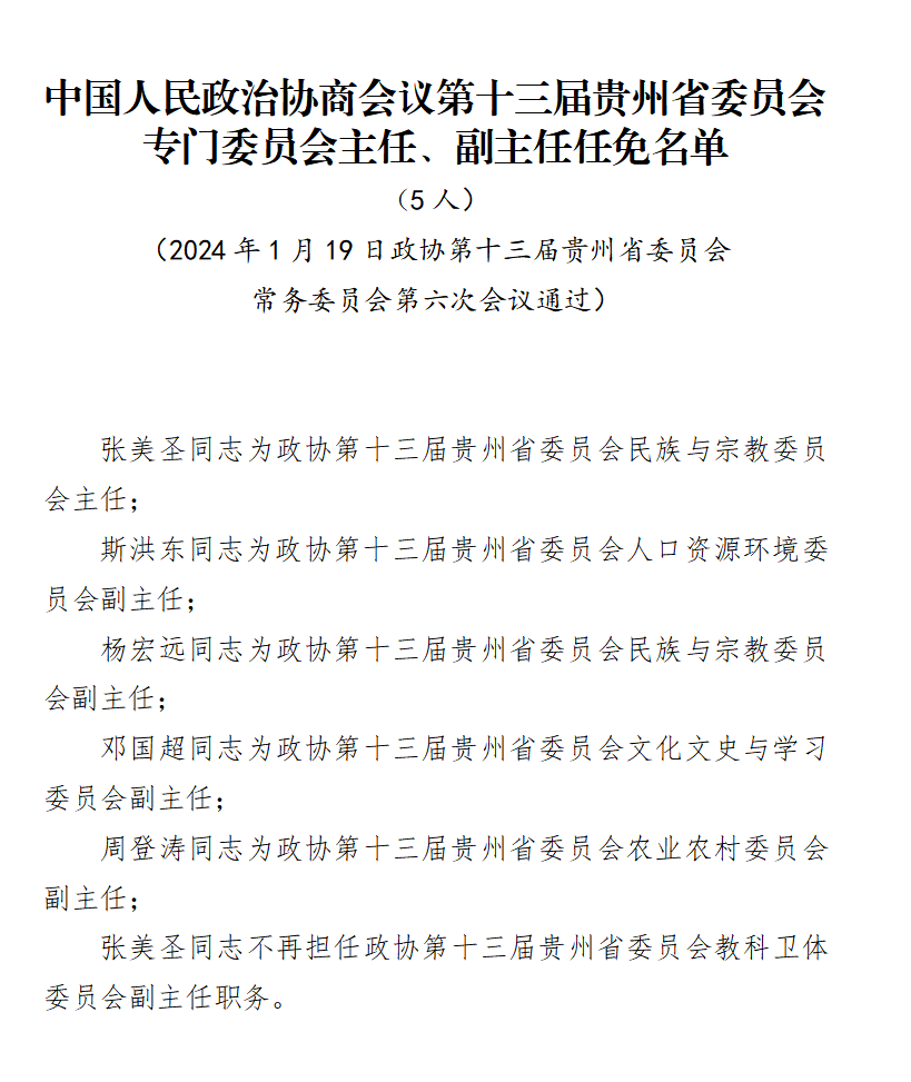 张美圣同志不再担任政协第十三届贵州省委员会教科卫体委员会副主任职务。