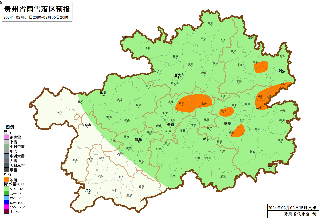 4日夜间到5日白天,除省的西部边缘多云外,其余大部地区多云转阴天有零星小雨,中东部地势高处有零星冻雨。