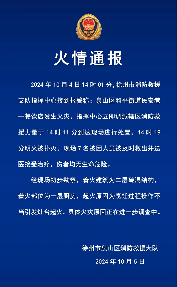 2024年10月4日14时01分,徐州市消防救援支队指挥中心接到报警称,泉山区和平街道民安巷一餐饮店发生火灾,指挥中心立即调派辖区消防救援力量于14时11分到达现场进行处置,14时19分明火被扑灭。现场7名被困人员被及时救出并送医接受治疗,伤者均无生命危险。