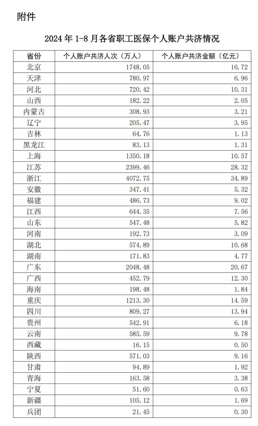 三、2024年1-8月职工医保个人账户共济2.18亿人次,比1-7月增长0.26亿人次;共济金额262.57亿元,比1-7月增长35.18亿元。