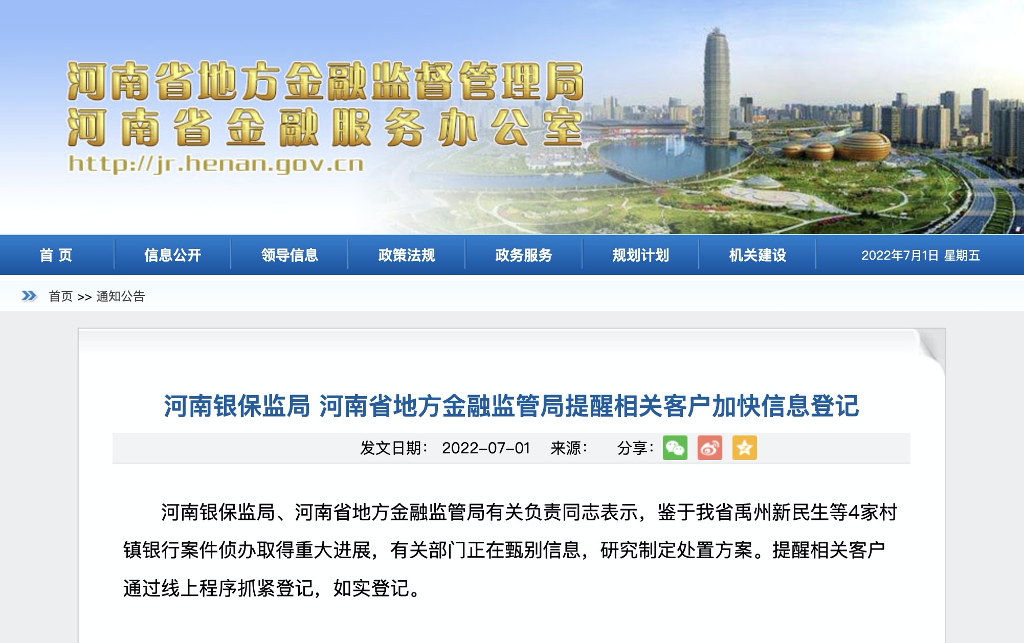 河南银保监局、河南省地方金融监管局有关负责同志表示,鉴于河南省禹州新民生等4家村镇银行案件侦办取得重大进展,有关部门正在甄别信息,研究制定处置方案。提醒相关客户通过线上程序抓紧登记,如实登记。