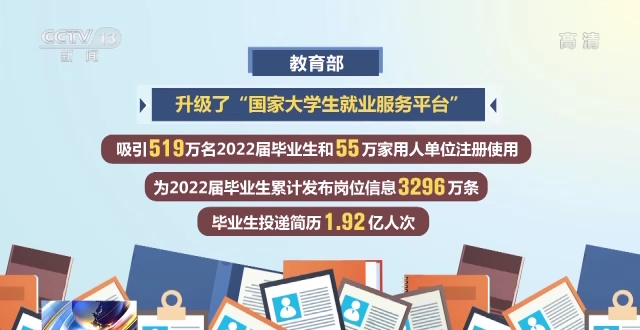 据了解,为广泛开拓市场工作岗位,教育部升级了“国家大学生就业服务平台”,吸引519万名2022届毕业生和55万家用人单位注册使用,为2022届毕业生累计发布岗位信息3296万条,毕业生投递简历1.92亿人次。