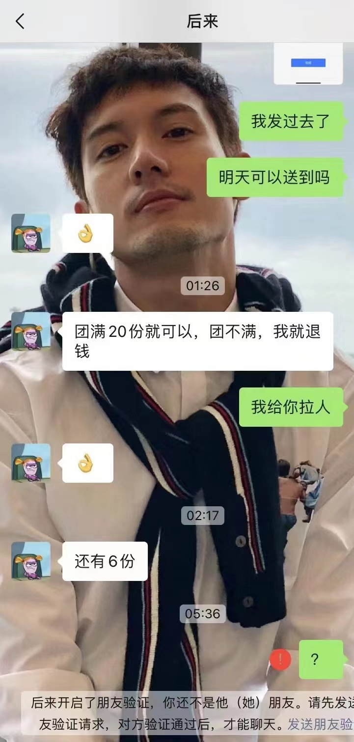 不料到9月7日,发布团菜信息的人就将其删除,并更换了头像,池先生这才发现自己被骗。“其实现在回过头来想一想,当时自己也够傻,大家物资都不够,我都没想过他哪来这么多物资。”池先生有些懊悔。