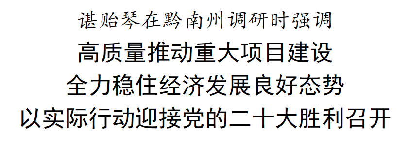 7月14日,省委书记、省人大常委会主任谌贻琴深入黔南州福泉市、瓮安县调研重大项目建设。她强调,要深入学习贯彻习近平总书记视察贵州重要讲话精神,积极抢抓新国发2号文件重大机遇,按照省第十三次党代会部署,坚持以高质量发展统揽全局,紧紧围绕实施主战略、实现主定位,高质量推动重大项目建设,全力稳住经济发展良好态势,以实际行动迎接党的二十大胜利召开。省委常委、省委秘书长陈少波参加调研。