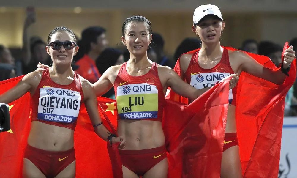 这是2019年多哈世锦赛,冠军刘虹(中)、亚军切阳什姐(左)与季军杨柳静在女子20公里竞走比赛后庆祝↑