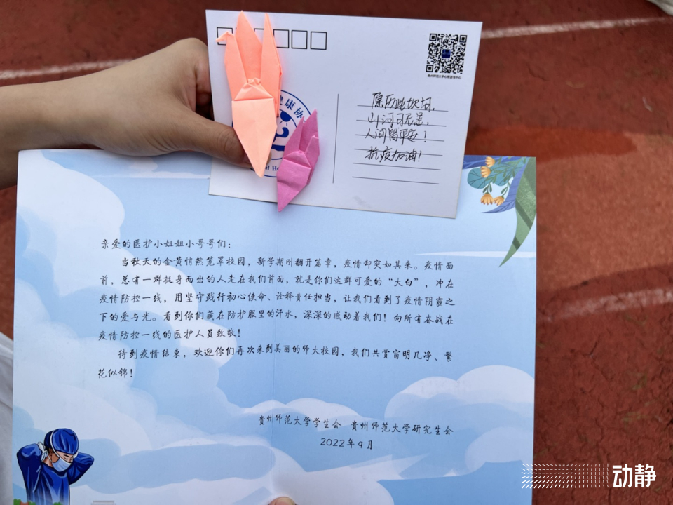 工作中,采样队员还收到了来自贵州师范大学学生会、研究生会送来的卡片,卡片上一段段暖心的话语,承载着沉甸甸的情谊,更是广大师生对贵州省人民医院医务人员最大的赞誉。