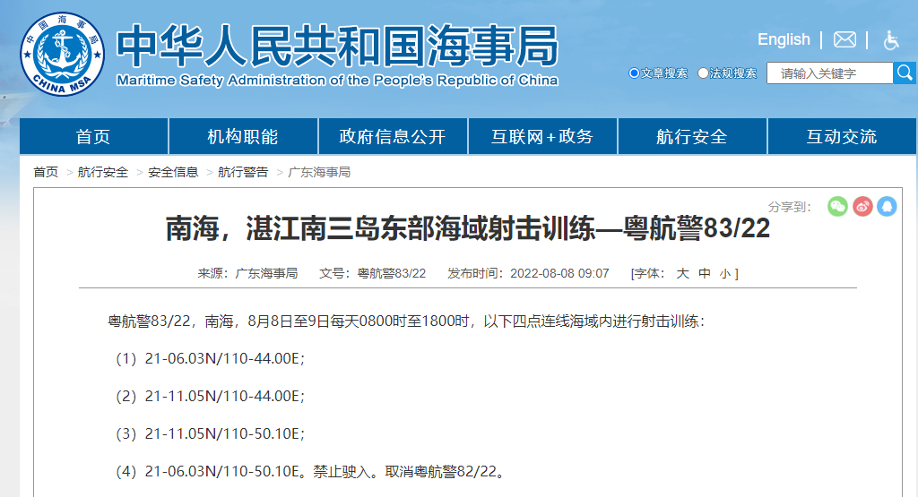 广东海事局发布航行警告,8月8日至9日每天8时至18时,南海湛江南三岛东部海域进行射击训练,禁止驶入。