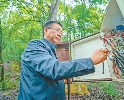 拄着木棍,听着脚踩树叶的沙沙声,穿梭于贵阳市长坡岭林场茂密的树林里,贵阳市林草资源监测中心主任颜伟仔细查看各个生态监测设备的运行情况。