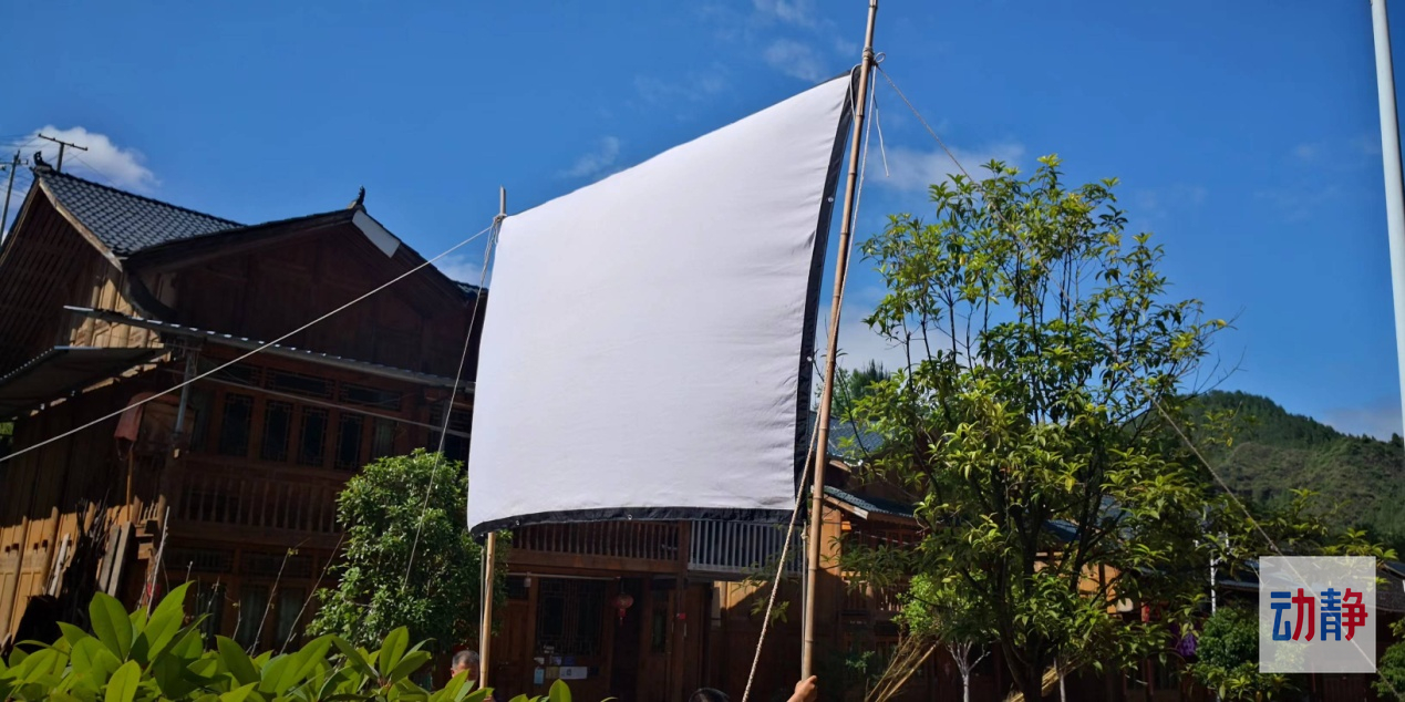 4米长3米宽的白色幕布下,老黎和同事正在架设放映机和音箱,固定位置、确定高度、牵线调试……所有工作准备就绪,天色渐渐暗了下来,老黎从包里拿出一张卡片插入放映机,点开按钮,随着音乐响起,大人们停止了交谈,孩子们停止了奔跑,所有人围坐在幕布前,等待着电影的开始。
