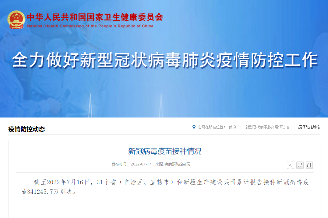 截至2022年7月16日,31个省(自治区、直辖市)和新疆生产建设兵团累计报告接种新冠病毒疫苗341245.7万剂次。