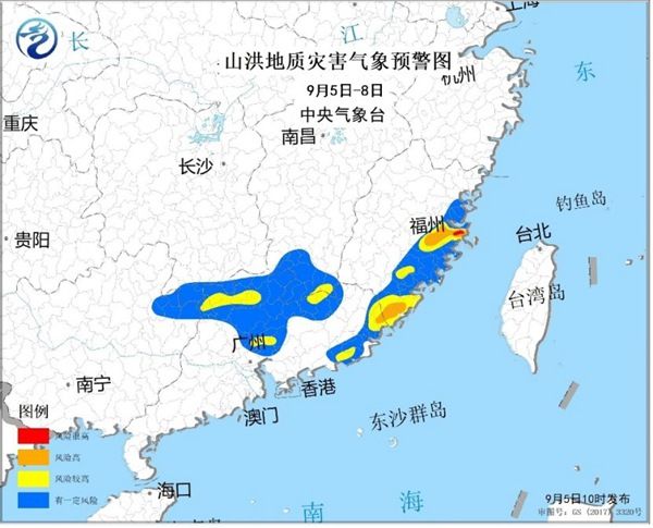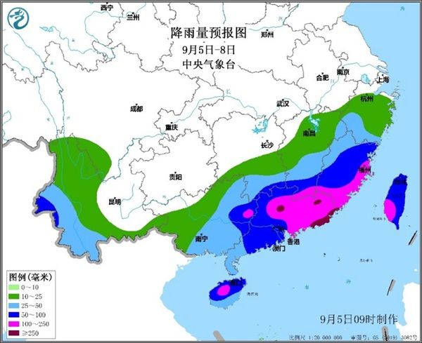 中央气象台预计,5日至8日,福建、广东、广西中东部、江西中南部、湖南南部以及台湾岛南部和东部等地有大到暴雨,其中,福建南部和东部沿海、广东中东部、江西南部等地部分地区有大暴雨,局地有特大暴雨;最大小时降雨量30~60毫米,局地80毫米以上,并伴有雷电。上述地区累计降雨量50~150毫米,福建东南部沿海、广东东部局地250~350毫米,单点雨量超400毫米,广东、福建等地部分地区降雨量可能突破历史同期极值。