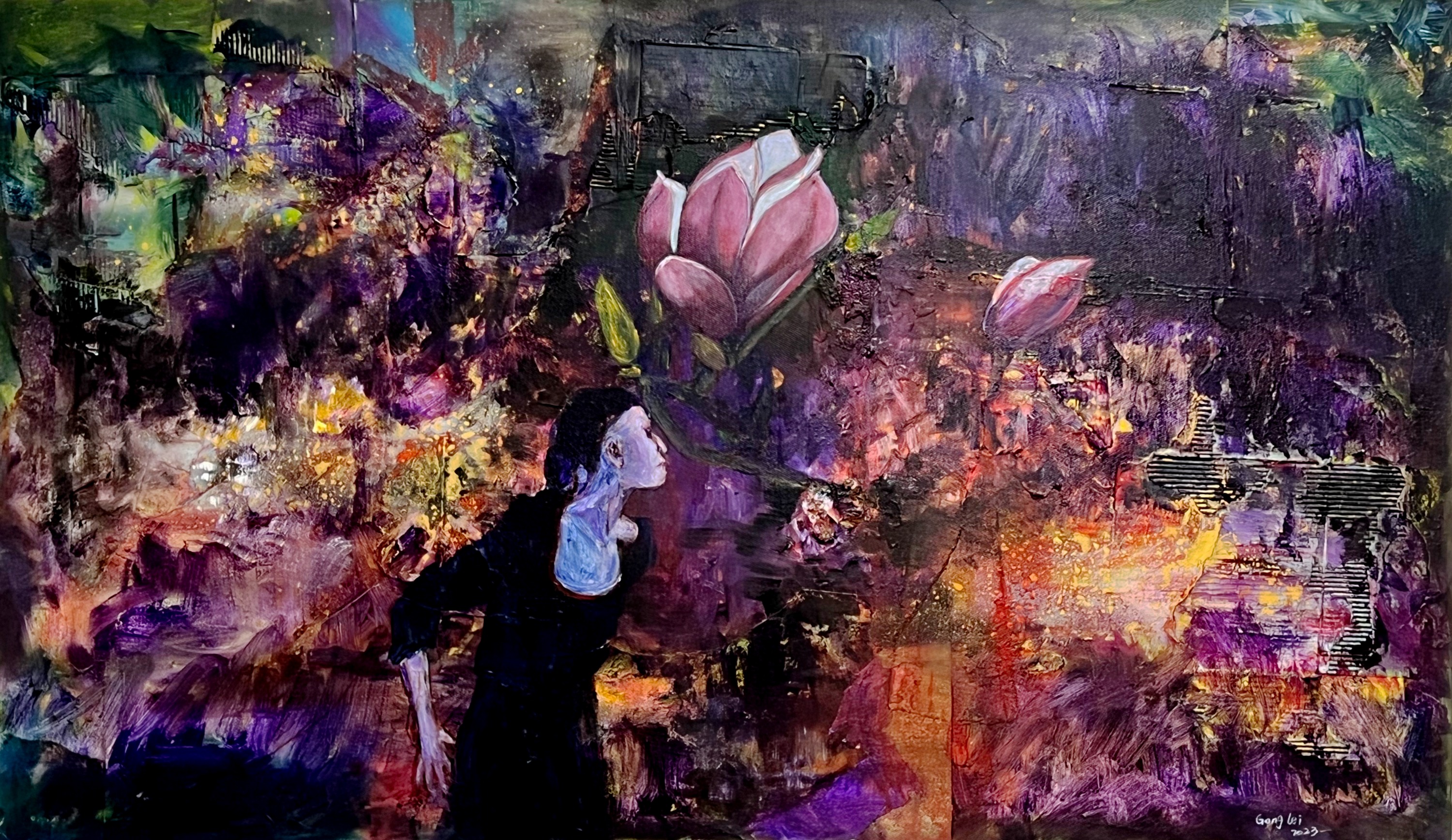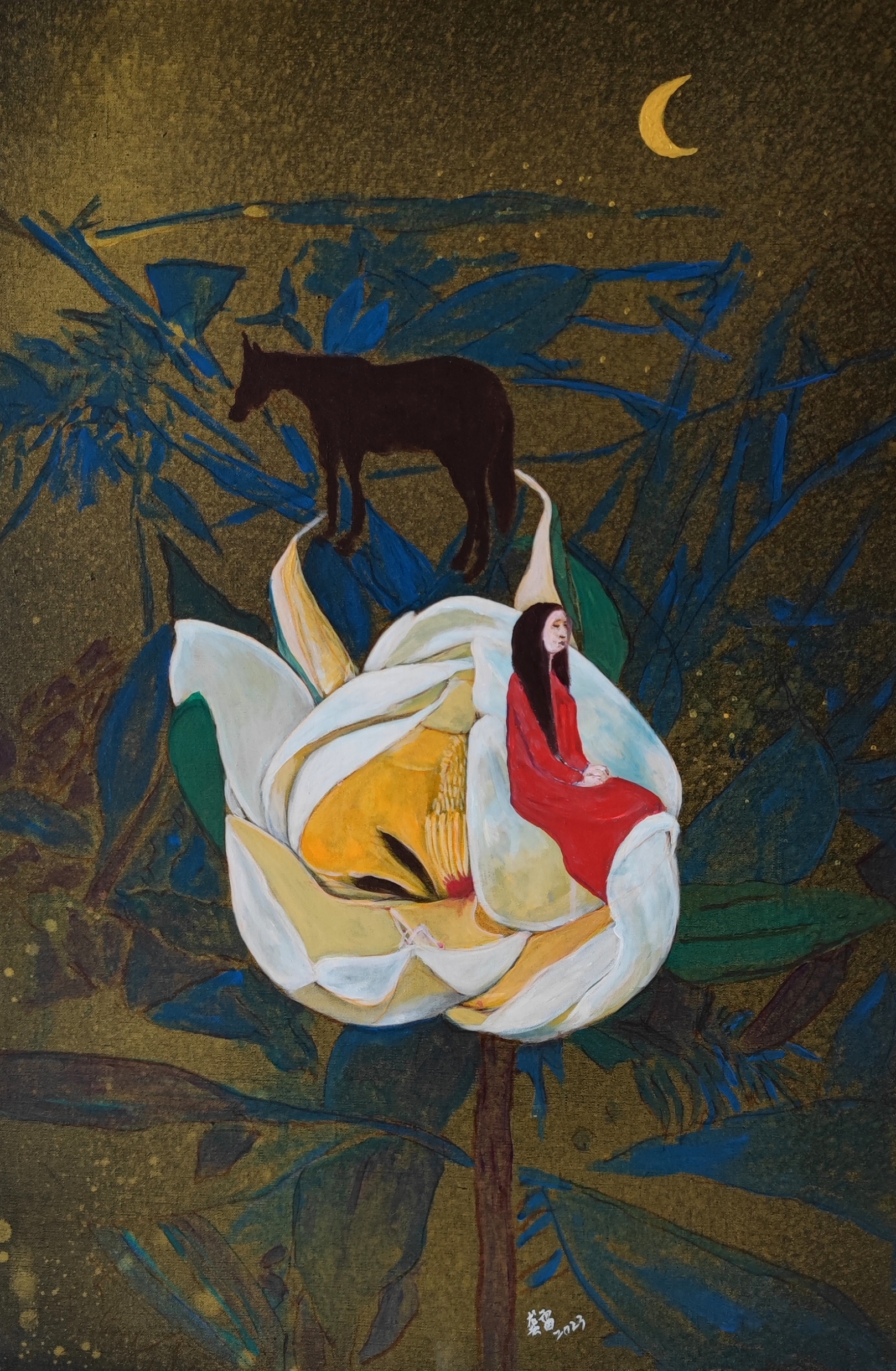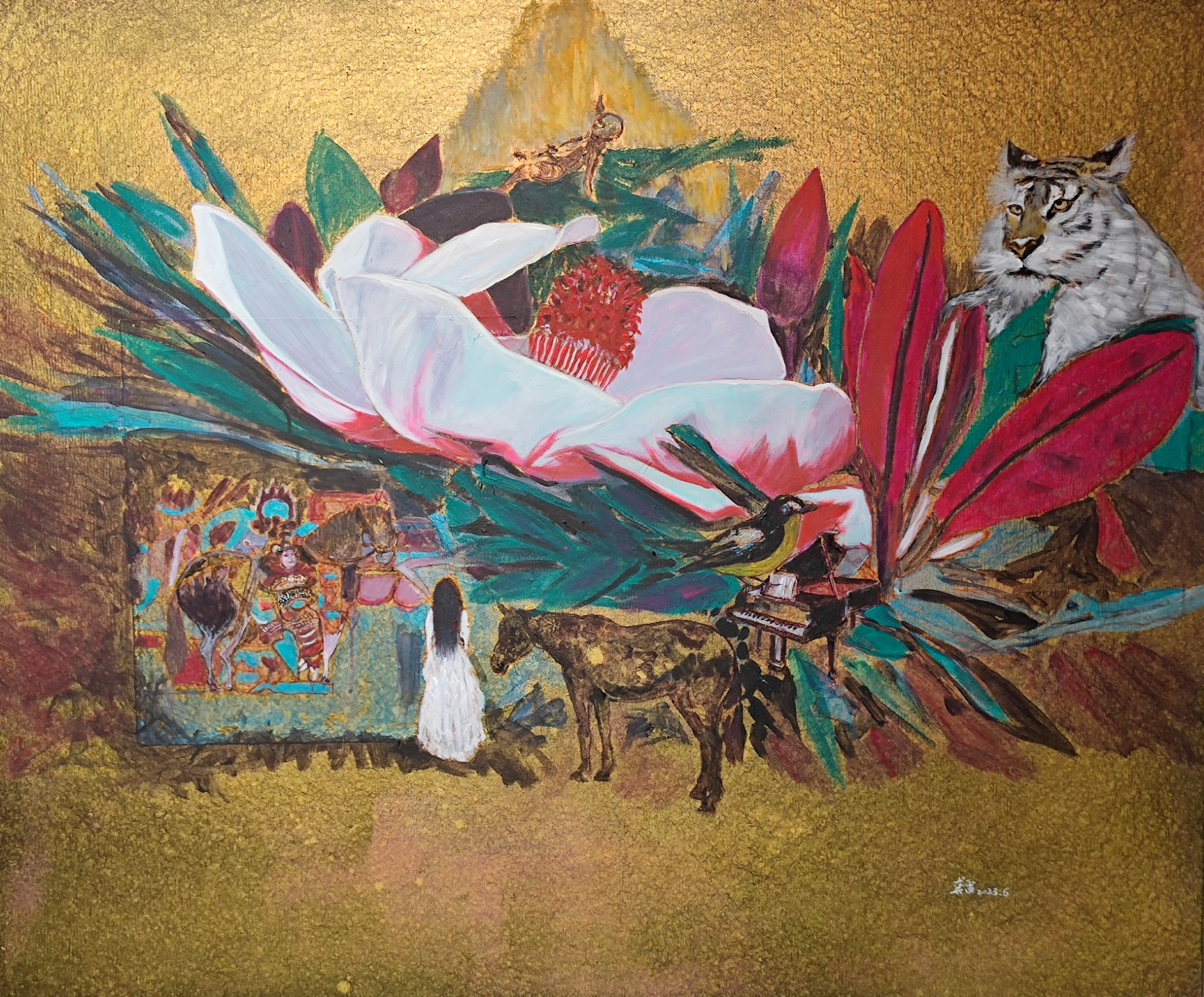 作品的画面感是神秘氛围密境,这些看似毫不相关的主题内容其实并非是随意选择的结果,它们的背后贯穿了艺术家对人类存在的意义和价值问题的思考。因此,关平干神秘氛围的作品表现的不仅仅是动人的花蕾、人与动物,实则是人在自然野性中生存活动的现实景象。画家在作品中去掉画油画时注重笔触的书写性,刻意追求氛围的抒情性,更加冷静与客观,关注“人与自然”存在的价值和意义。而这些具有冷静感、故事感的画面,是还原精神世界的“绝对真实”,艺术是粗粝坚定的,通过创造出的造型、醇厚浑润的色彩,皆是龚雷内心的外放表达。
