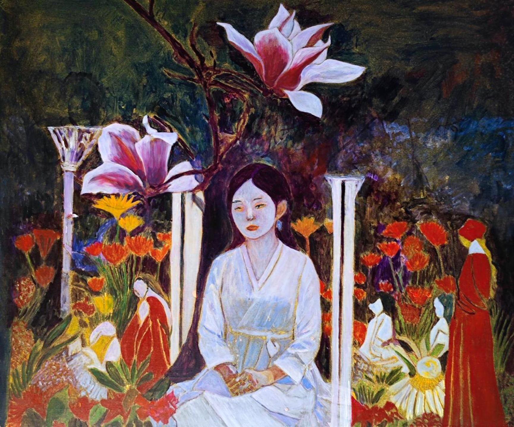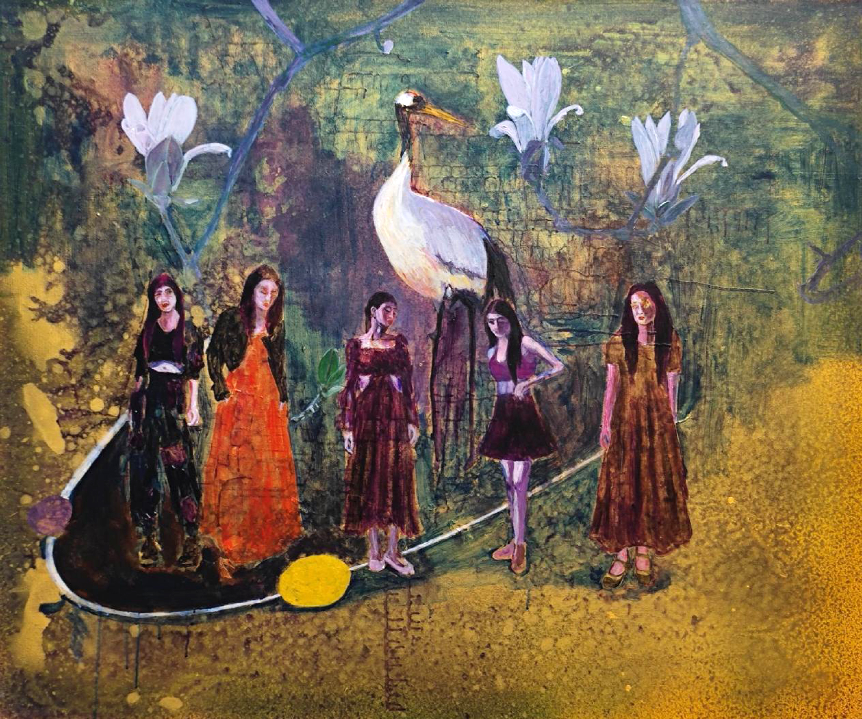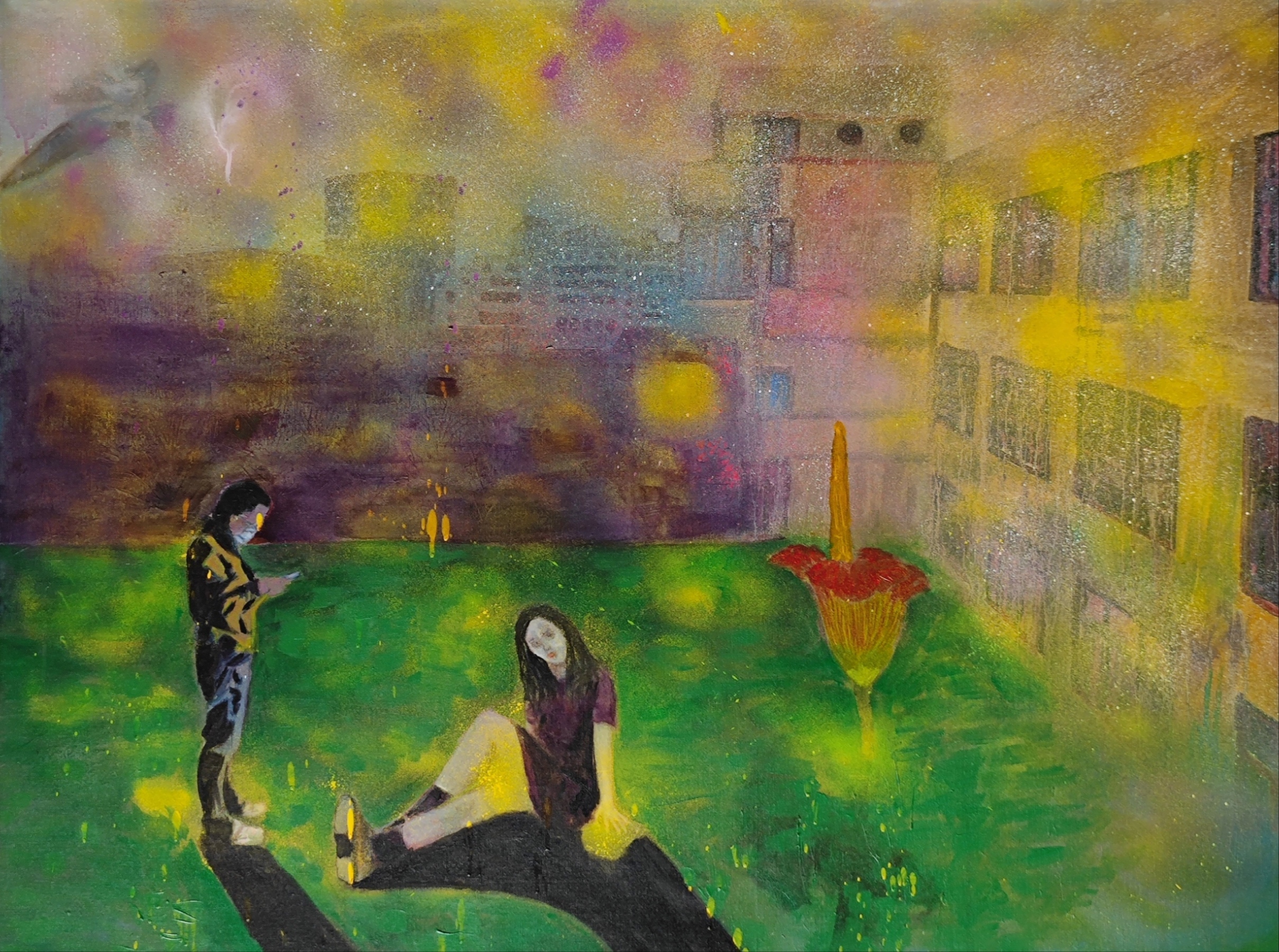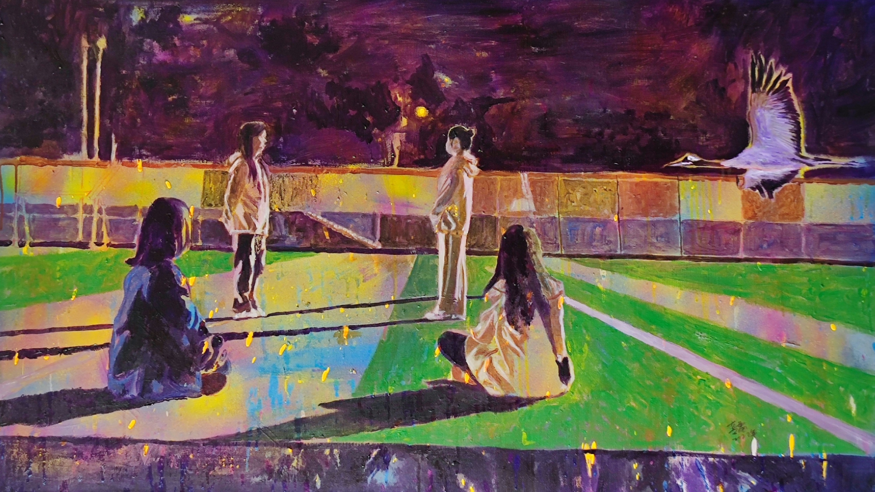 作品的画面感是神秘氛围密境,这些看似毫不相关的主题内容其实并非是随意选择的结果,它们的背后贯穿了艺术家对人类存在的意义和价值问题的思考。因此,关平干神秘氛围的作品表现的不仅仅是动人的花蕾、人与动物,实则是人在自然野性中生存活动的现实景象。画家在作品中去掉画油画时注重笔触的书写性,刻意追求氛围的抒情性,更加冷静与客观,关注“人与自然”存在的价值和意义。而这些具有冷静感、故事感的画面,是还原精神世界的“绝对真实”,艺术是粗粝坚定的,通过创造出的造型、醇厚浑润的色彩,皆是龚雷内心的外放表达。