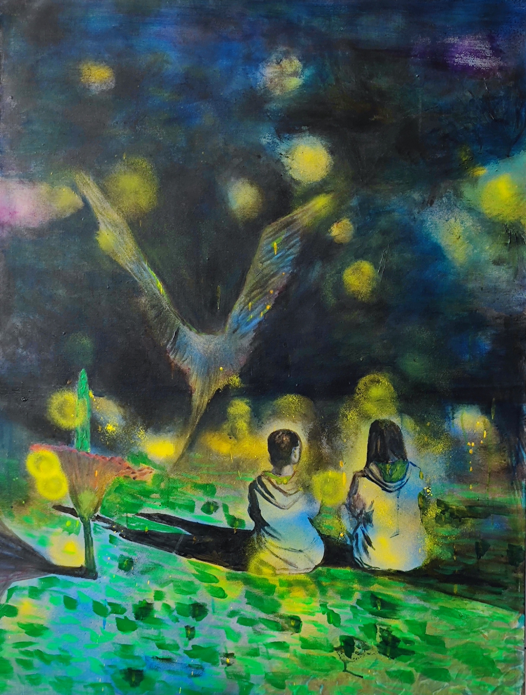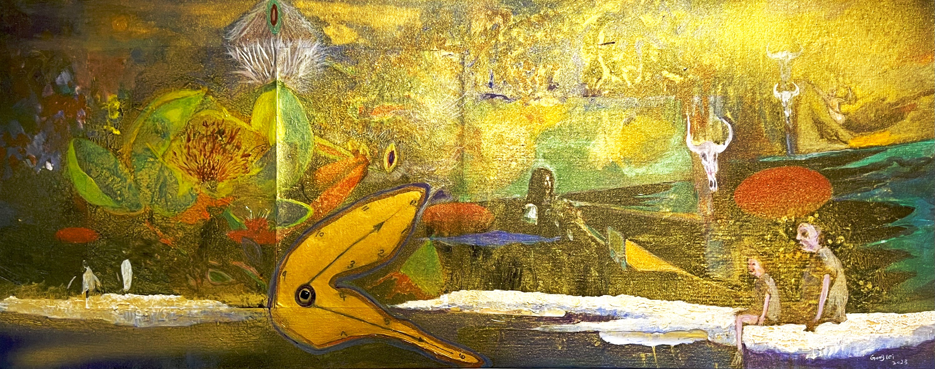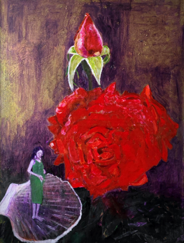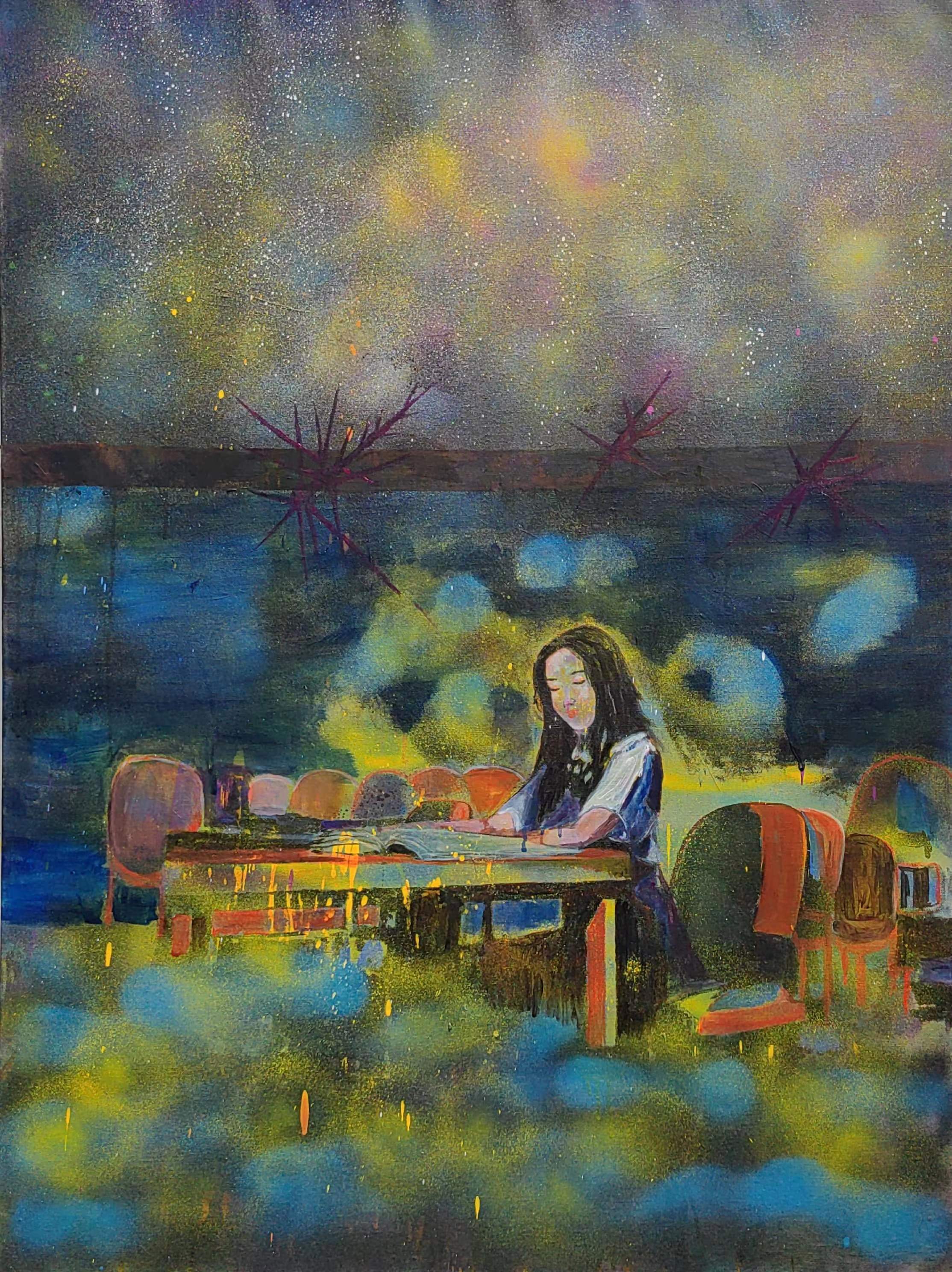 作品的画面感是神秘氛围密境,这些看似毫不相关的主题内容其实并非是随意选择的结果,它们的背后贯穿了艺术家对人类存在的意义和价值问题的思考。因此,关平干神秘氛围的作品表现的不仅仅是动人的花蕾、人与动物,实则是人在自然野性中生存活动的现实景象。画家在作品中去掉画油画时注重笔触的书写性,刻意追求氛围的抒情性,更加冷静与客观,关注“人与自然”存在的价值和意义。而这些具有冷静感、故事感的画面,是还原精神世界的“绝对真实”,艺术是粗粝坚定的,通过创造出的造型、醇厚浑润的色彩,皆是龚雷内心的外放表达。