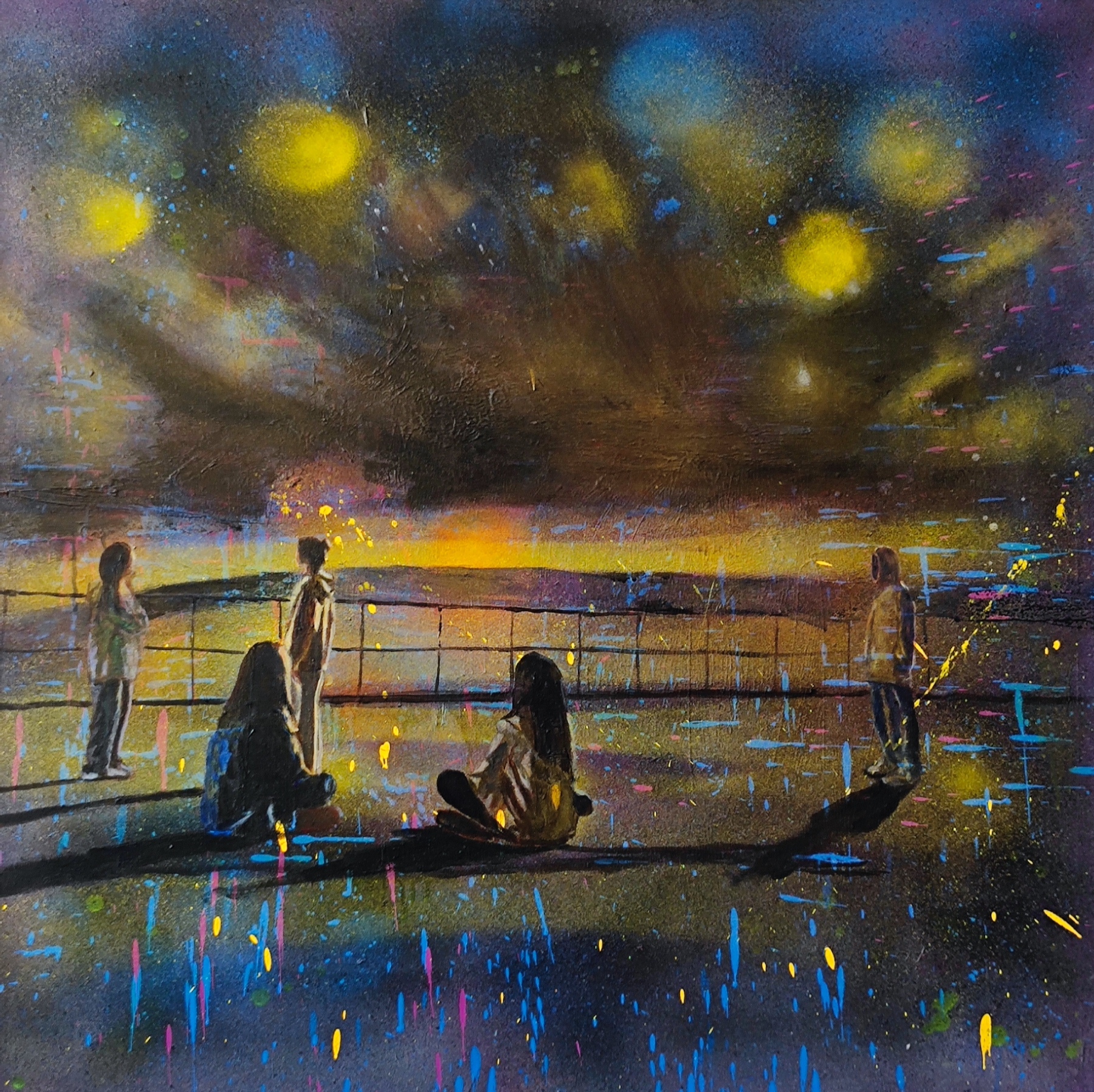 然而,更重要的是,我们不应该忽略综合材料在其中起到的作用。实际上,在《花间记》的创作中,龚雷就已经开始尝试综合材料的应用,那些在沉重色调中闪现出来的鲜艳光芒正是源于某些材料的特殊质地。在高科技媒介层出不穷的今天,龚雷在材料方面的探索完全算不上科学研究,相反,他其实是在往回走,从古人用的各种矿物颜料中物色自己所需。显然,这样的研究不仅带来视觉上的特殊效果,而且也必定会带来新的灵感。在《波德莱尔的戏剧》第5号(图十)作品中,手绘被大量喷射颜料所取代,泛滥的金色颗粒让整个画面闪耀着光芒,令人想起波德莱尔的诗句:
