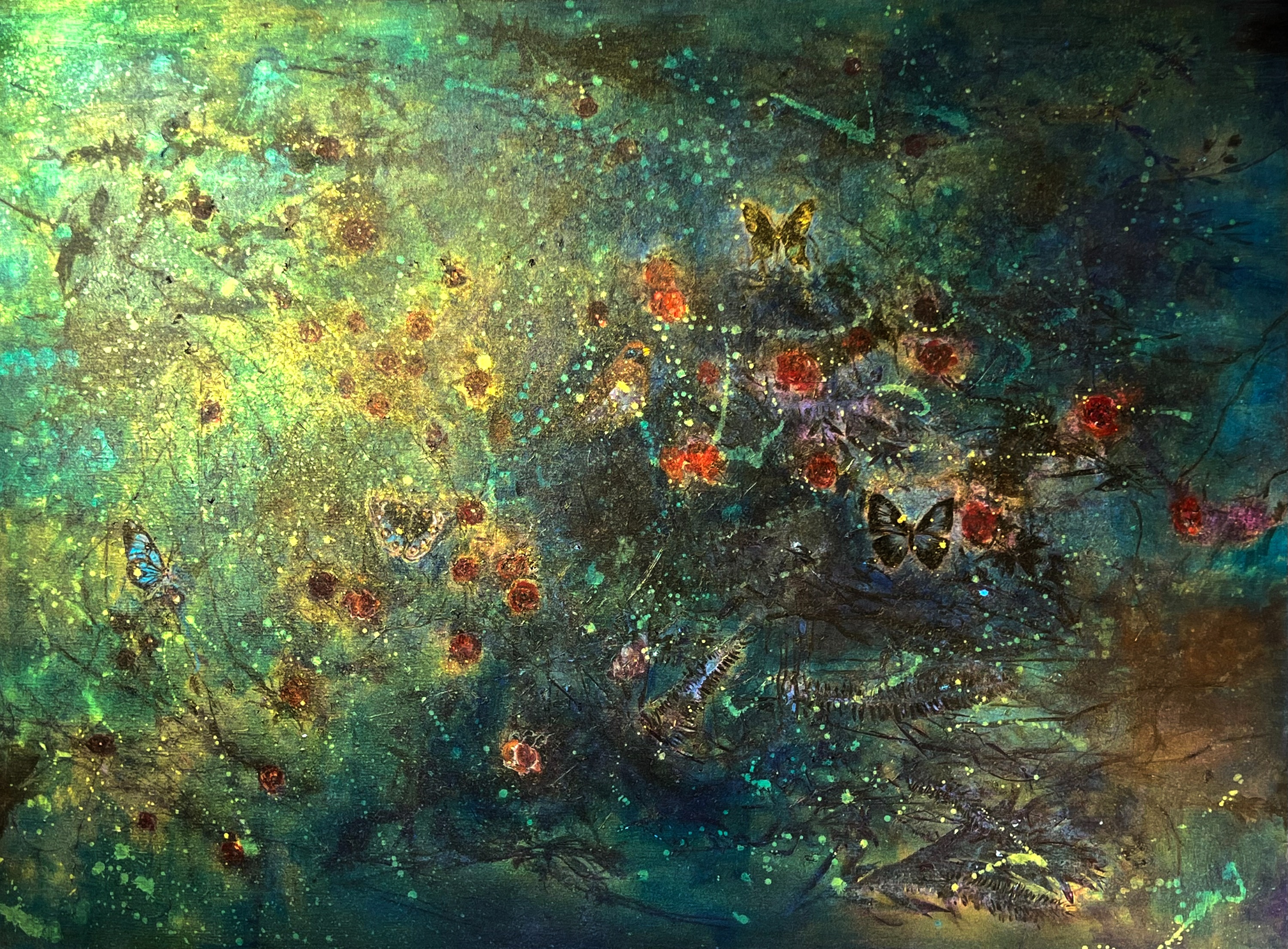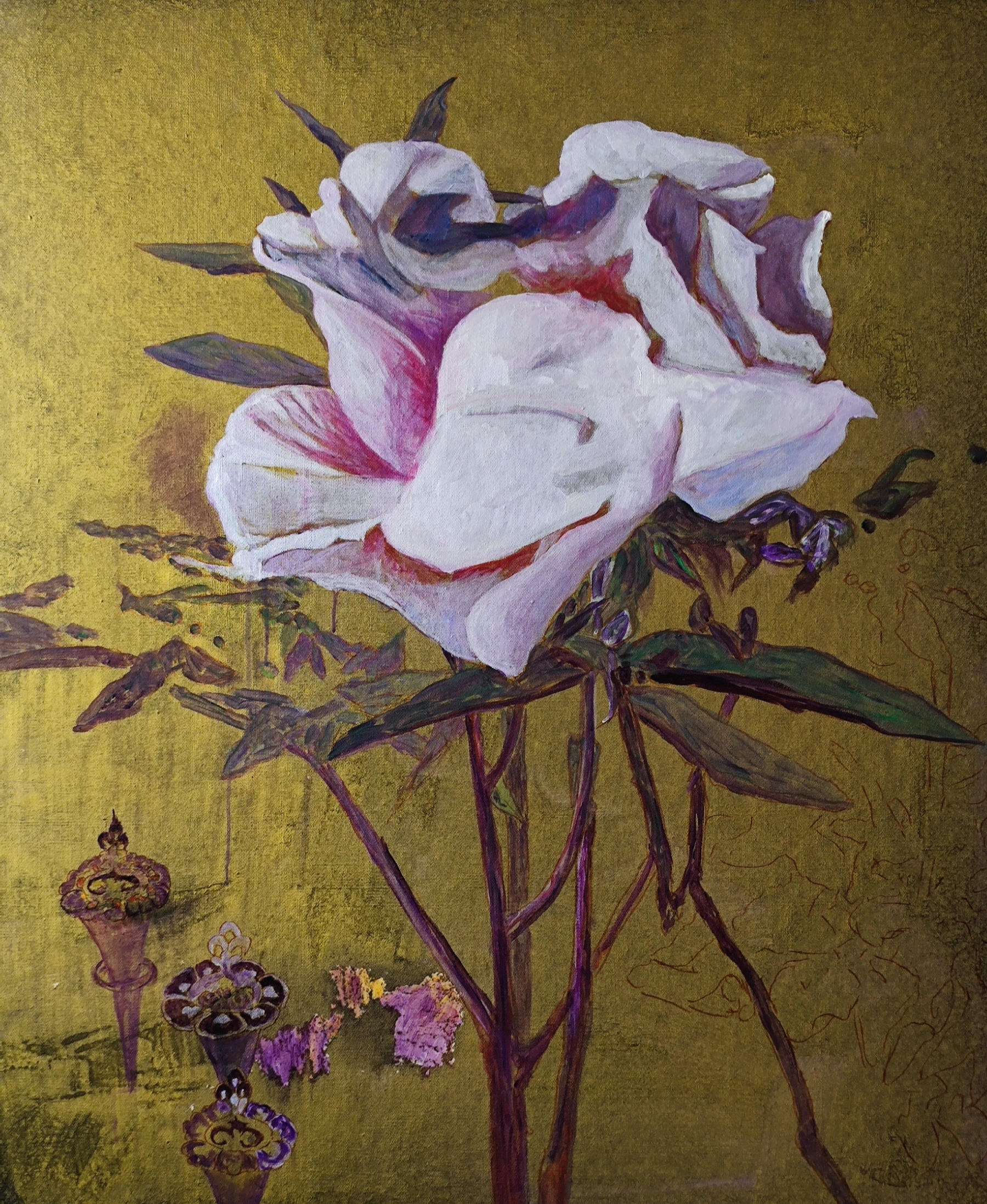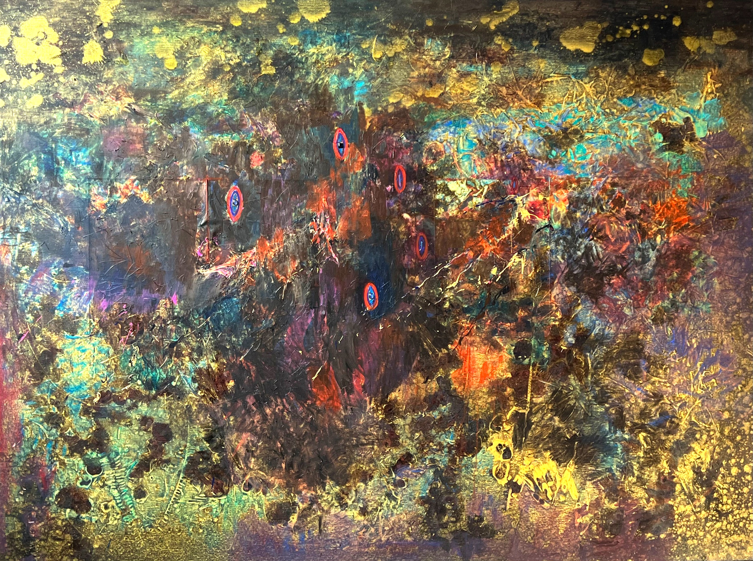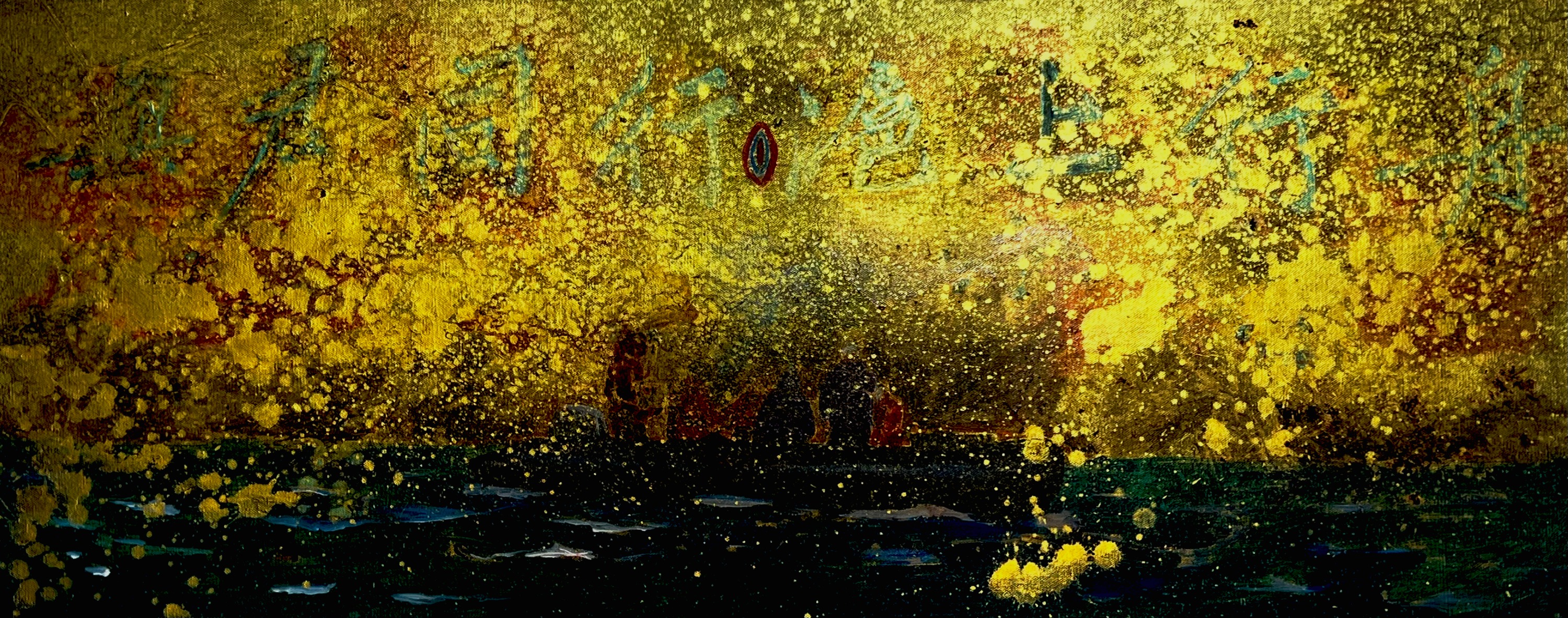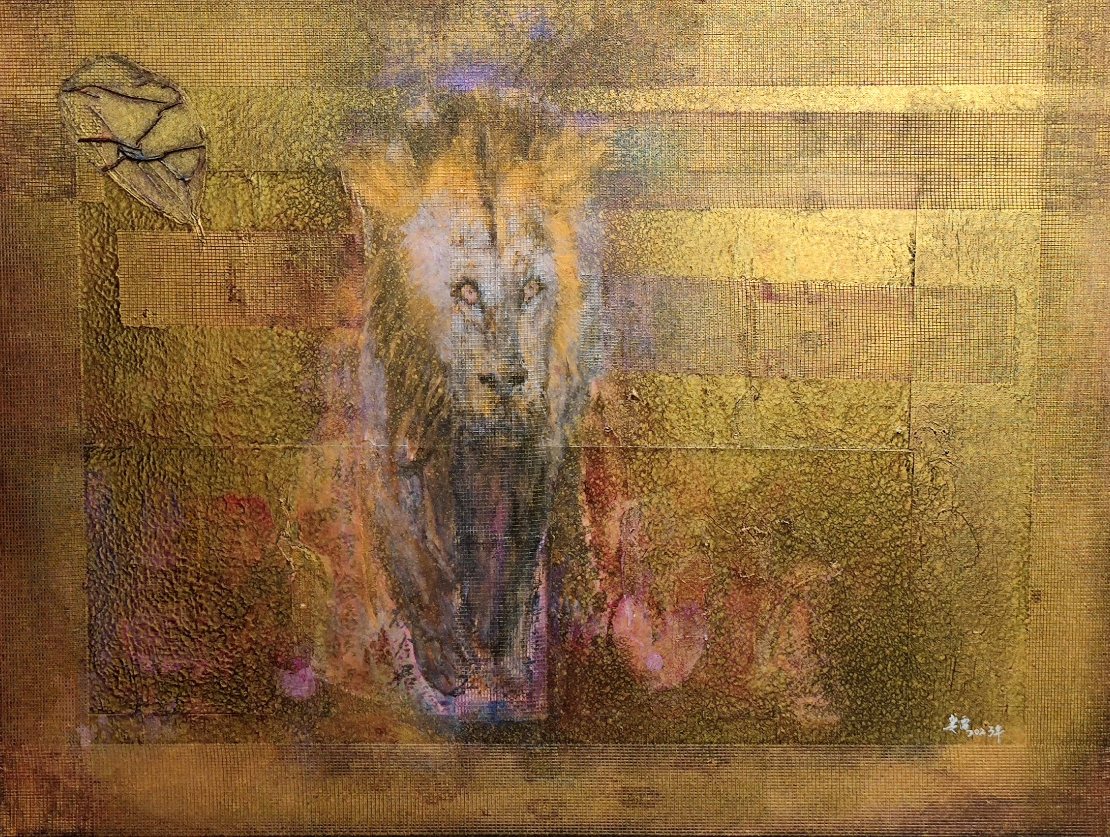 在龚雷最近的一件综合材料作品《命运的重组》中,可以看到曾经在《花间记》系列作品中作为造型手段或叙事氛围的一些传统艺术语言和材料工艺(借鉴于如敦煌岩彩画、青绿山水、鎏金工艺等)已经成为画面的主体,它们实际上就是民族传统文化的含蓄表达,甚或也就是融汇了古今中外文化的新的民族性的构建。在几幅已经开始创作但尚未完成的作品中,还可以看到隐约浮现于灿烂金色肌理间的东坡诗文,它们没有“贴面”之感,而是在手工劳作间,潜意识地流露出一脉相承的文人雅致趣味。