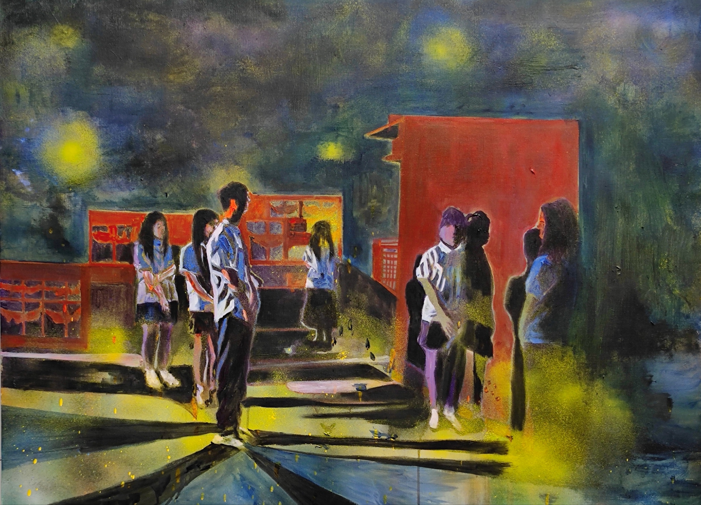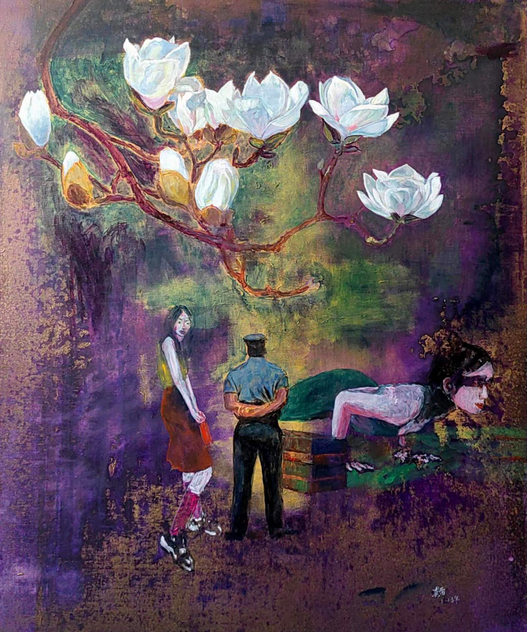 在《花间记》系列作品中(图三),龚雷一贯的表现性笔触仍然显而易见,但与早先作品不同的是,它们不再肆意地渲染氛围,而是开始追随具象化的造型,这些造型仍然不大规矩,但已经足以构成情节。在晦暗不明的叙事中,十分突出的形象是花,花间有女人,一个,两个,或三五个;她们大多装扮时尚,姿态婀娜,面目与神情却诡异,而尤其诡异是常有一只大鹤出没其间(图一、图二)。如果说以上这些被反复强调的,梦境式的碎片化符号营造了一种迷幻的氛围,那么第二号作品(图四)中突兀于视觉中心的男子背影则似乎有意将话题拉回现实,这个身着某种执法制服的形象让其身边的女子陷于风尘,而背景里一对对补色的纠缠混淆加剧了情境感,而整个离奇的画面也因此被赋予了近乎直白的社会意义。