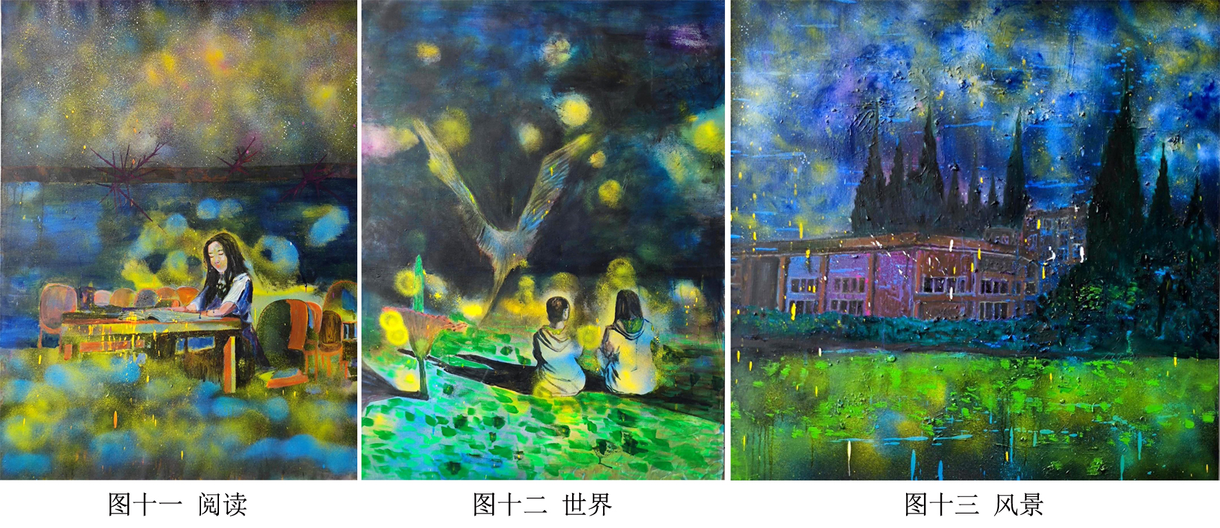 在《波德莱尔的戏剧》的创中,龚雷获得了一种新的经验,即一种经由材料应直接思想的方法,并且从“波德莱尔的戏剧”舞台上投射到若干独幅作品中去,在《阅读》(图十一)《世界》(图十二)《风景》(图三)等作品中形成了较稳定的风格特征,继而在更新的一系列创作中延展出抽象的形式。