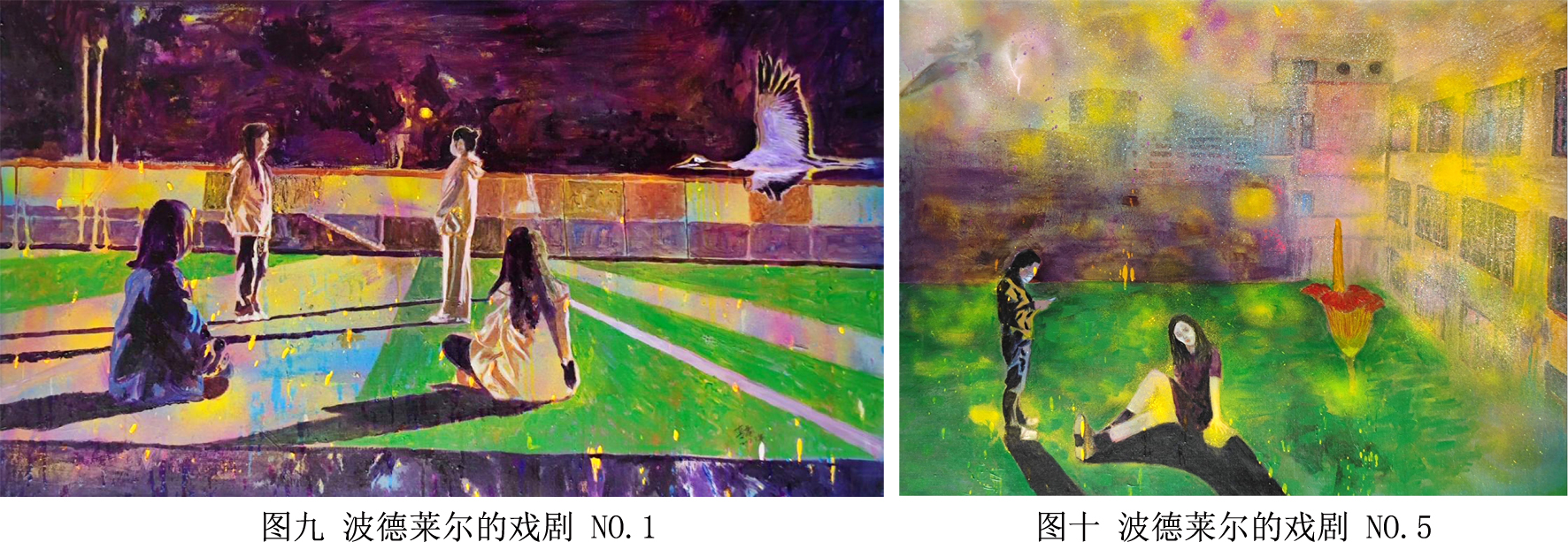 龚雷的这种探索在另一个系列中显示出新的进展。这个题为“波德莱尔的戏剧”的系列作品(图九)就名称来说,似乎有着更直白的语音表达倾向,并且就其具体的视觉形式来看也如题那般有着深沉的隐喻性:更具体的再现性造型刻画,更少的表现性笔触;欲言又止的叙事性场景,卡拉瓦乔式的戏剧性光影、波德莱尔(Charles Pierre Baudelaire)式的象征性情境、夏加尔(Марк Шага́л)式的迷幻感氛围……