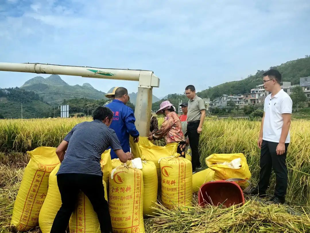 在黔西南州晴隆县光照镇,金色田野上,水稻收割机开足马力收割,风禾尽起,盈车嘉穗。