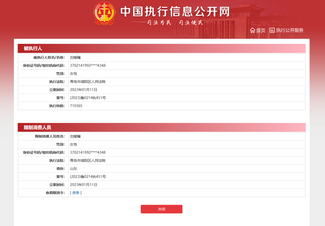 据中国执行信息公开网显示,1月16日,青岛市城阳区人民法院向刘暖曦(曾用名:刘鑫)发布限制消费令,对其采取限制消费措施,包括不得乘坐飞机、列车软卧、轮船二等以上舱位,不得旅游、度假等。