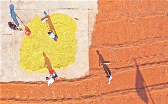 初秋时节,各地农民抢抓晴好天气忙着抢收、抢晒,勾勒出一幅幅美丽的田园风光和繁忙的劳动景象。图为近日村民在贵州省黔东南苗族侗族自治州岑巩县天马镇雷公田村晾晒玉米和高粱。
