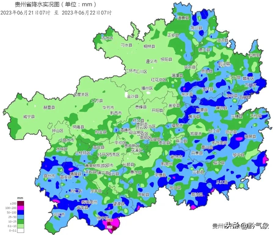 6月21日07时至22日07时,特大暴雨出现在册亨县域内的3个观测站(巧相208毫米、百口204.2毫米、弼佑203.4毫米),大暴雨出现在罗甸、荔波、兴义、安龙、晴隆、盘州、册亨、余庆、望谟、普安、思南、平塘、黎平、剑河、碧江、锦屏、兴仁17县(市、区)域内的31个观测站,暴雨出现在46县(市、区)域内的323个观测站,大雨有740个观测站。