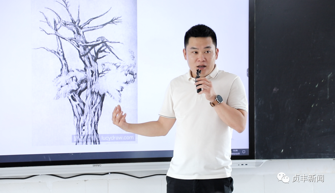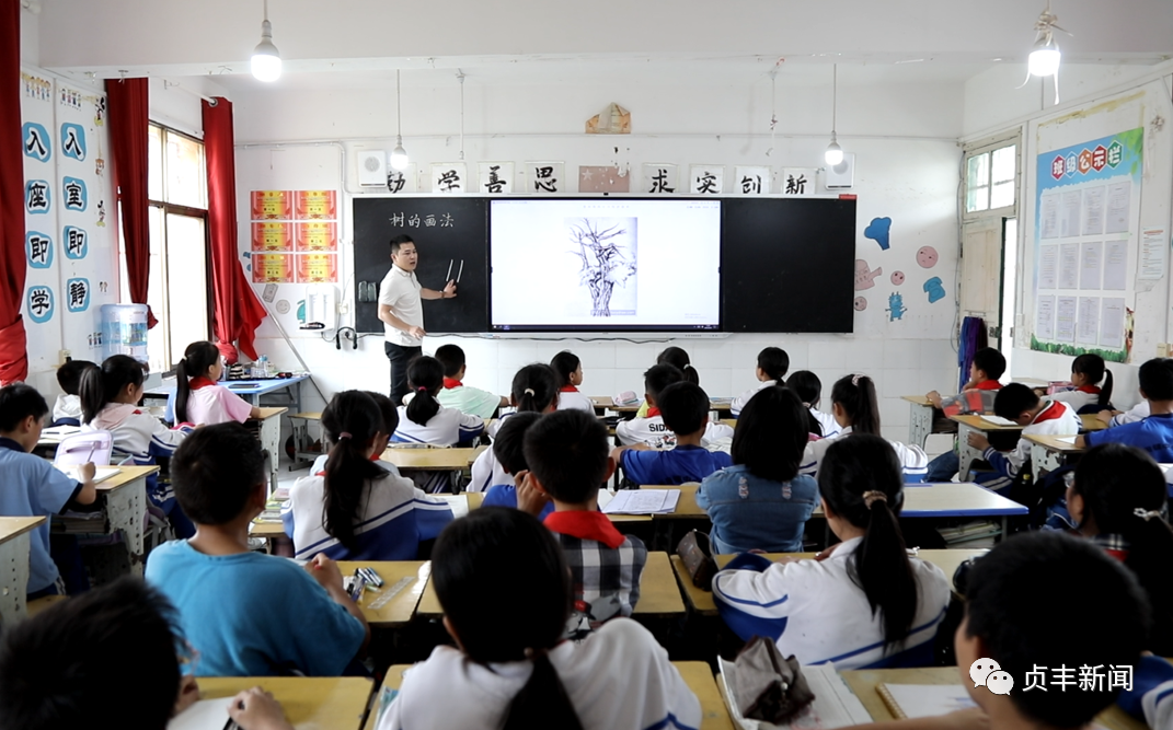 “潘老师给我们上课的时候会专注地讲画的画法,有树叶、树枝等,还有各种小动物,偶尔还带我们去写生,会更亲近大自然。”贞丰县长田镇长田中心小学五年级学生李馨说。 “我认为潘老师上课很活跃,他上课的时候,会先亲笔示范再让我们画,给我们找好头绪,我觉得潘老师的课很有趣。”贞丰县长田镇长田中心小学五年级学生郑连欢说。