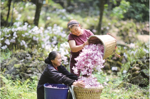 近日,在贵州省赤水市复兴镇凯旋村,村民将刚采摘的金钗石斛鲜花装筐。眼下,赤水市9万余亩金钗石斛进入盛花期,当地农民忙着采摘、分拣、加工石斛花供应市场。